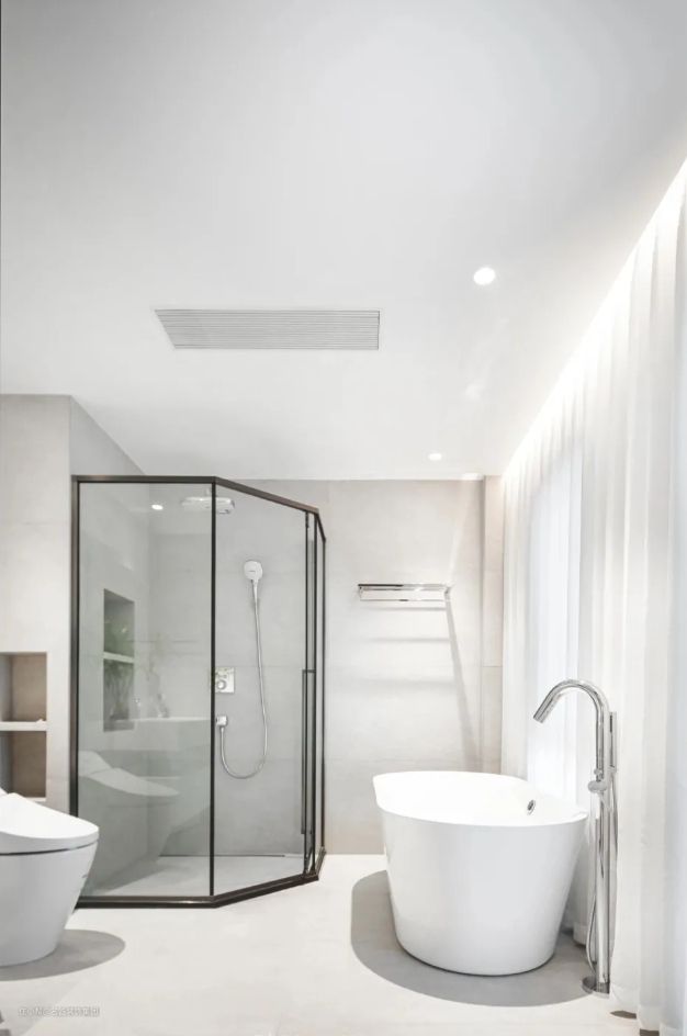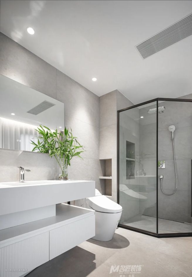 1、卫生间整体以白色为主色调,能够有效地反射光线,使卫生间显得更加明亮。悬空的洗手台设计不仅节省空间,还能使卫生间看起来更加宽敞和整洁。白色大理石的台面,增强整体的明亮感和洁净感。 2、采用极简风格框架的玻璃门将淋浴区域隔开,不仅能保持卫生间的干湿分离,还能增加空间的通透感。