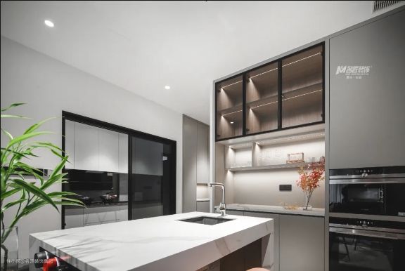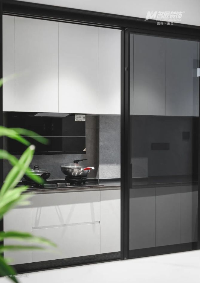 1、U型厨房布局是一种高效的设计,能够在有限的空间内提供最大的工作区域和储存空间。 2、黑色框架的落地推拉玻璃窗不仅能够提供充足的自然光线,增强空间的开阔感,可以隔断厨房的油烟,避免油烟飘到餐厅。