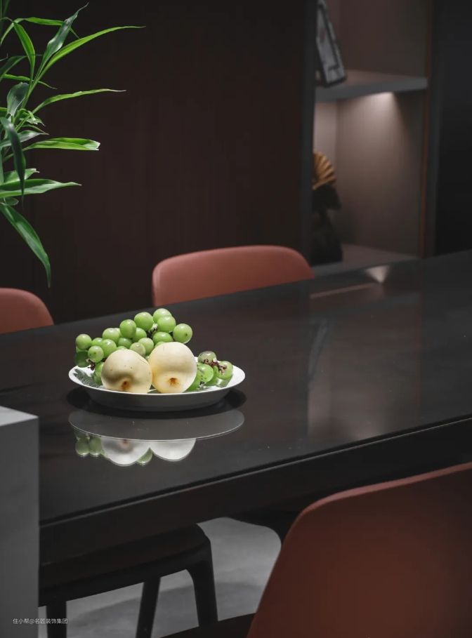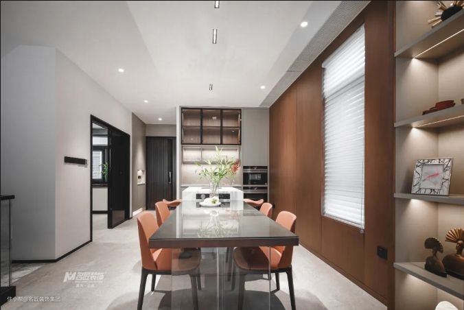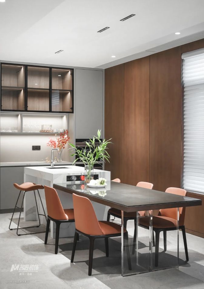 1、黑色长方形餐桌:黑色餐桌将为餐厅提供一个醒目的视觉焦点,并且与岩板岛台的质感相协调。 2、岩板材质的岛台耐用且易于清洁,配备洗手盆后,不仅实用而且提升了整体厨房的质感。 3、灰白色餐边柜为空间增添了一抹轻盈感,选择带有黑色玻璃门的设计,既增强了设计的现代感,又提供了展示和储藏的功能。