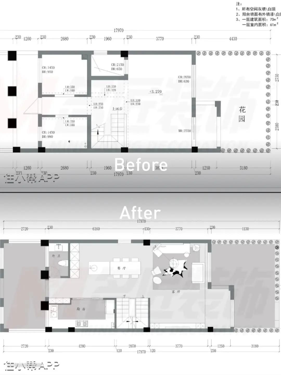 原户型:一层的建筑面积70㎡长方形布局,空间划分得过于零碎,室内光线不足,厨房和卫生间布局不合理