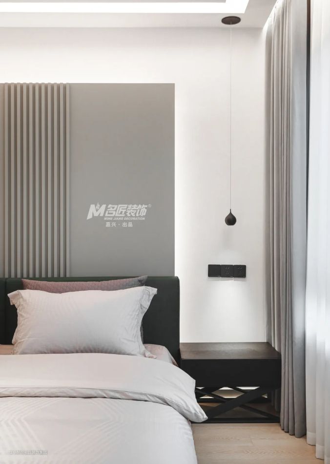 主卧灰色格栅背景墙不仅为卧室带来质感和深度,床头的边吊是一种优雅的照明选择,能够提供充足的光线,同时也增强房间的现代感。 将主卧与衣帽间相连,采用开放式的入口,空间更流畅性和宽敞,同时给业主提供一个实用而私密的空间,便于更衣和梳妆。 考虑到背景墙和边吊的现代感,床品选择了柔和的米白色,平衡整体色彩。