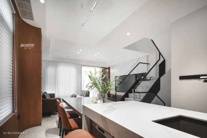 1、U型厨房布局是一种高效的设计,能够在有限的空间内提供最大的工作区域和储存空间。 2、黑色框架的落地推拉玻璃窗不仅能够提供充足的自然光线,增强空间的开阔感,可以隔断厨房的油烟,避免油烟飘到餐厅。