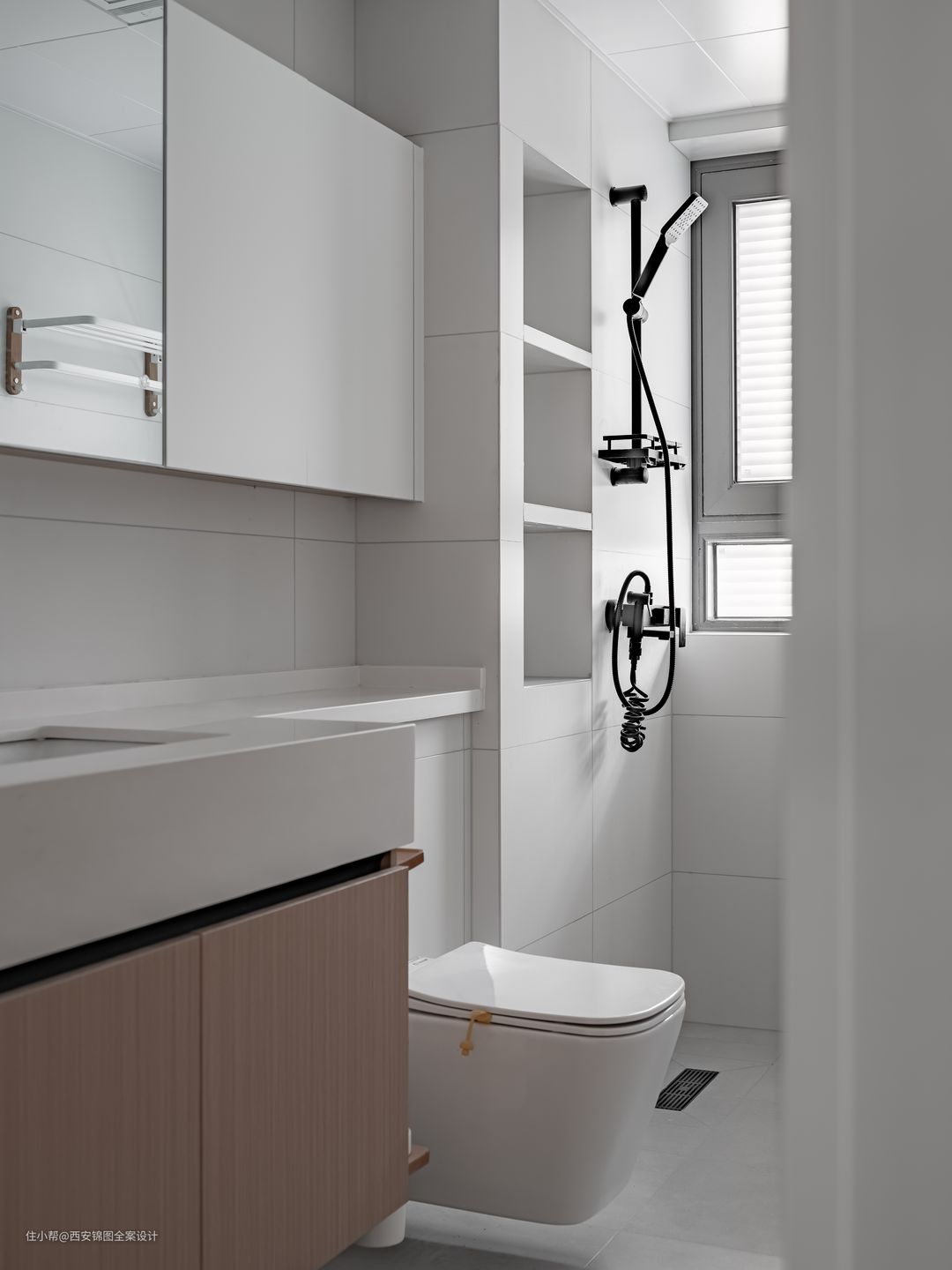 卫生间马桶选用墙排式悬空马桶,不仅颜值高,悬空的设计利于打扫,不留卫生死角.白色瓷砖通铺从视觉上延伸空间感,小小卫生间也可以凸显精致感和氛围感.