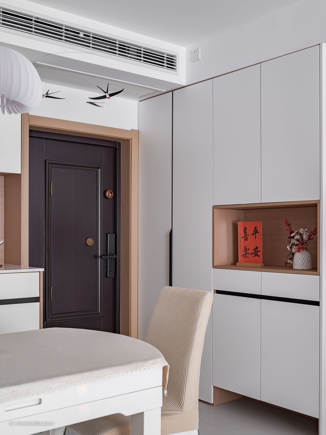 餐厅整体空间由白色、原木构成,让空间的材质和色彩关系更加密切,整体感更强.巧妙利用柜体上面的空间安装中央空调,营造利落的视觉感. 靠墙设置两面定制柜,一面作为餐边柜,一面作为鞋柜,围绕着进和出这两个动作,打造清爽自如的颜面.餐边柜中部镂空,可作为水吧台.
