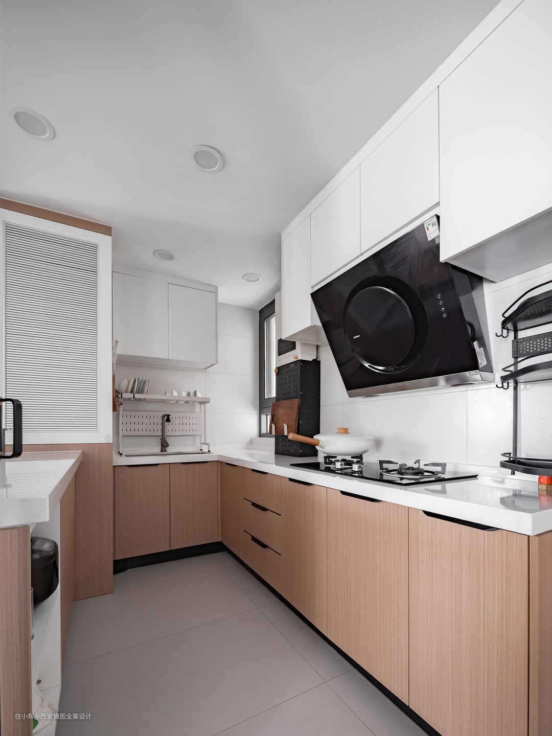 开放式厨房空间,取消实体墙,采用玻璃折叠门连接餐厅,让空间可分可合,与家人互动交流也更方便畅通又能保证油烟进入不了公区,为厨房引入光线的同时扩大餐厅视野. 石英石与木制拼接橱柜,整合了烹饪空间,呈现自然净透的空间质感,同时又和全屋整体基调具有互通性.