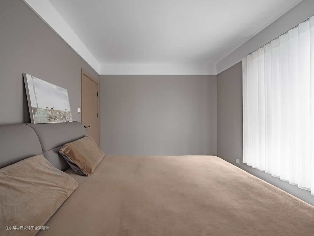 次卧选用佐敦12182色乳胶漆,浅色的灰色调,柔和且温暖,呈现出温馨宜居的观感,摒弃许多不必要的装饰.一侧梦幻帘,让阳光肆意洒满房间.