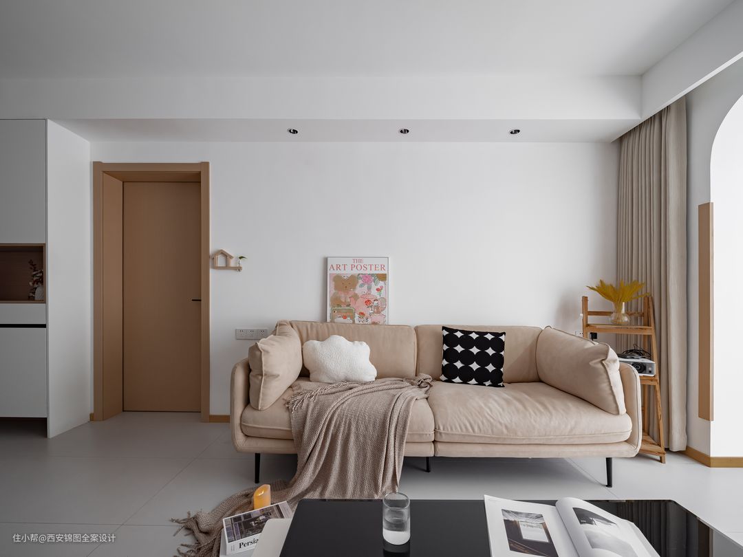 客厅采用无主灯设计,光源分散,让家更有氛围感. 整体色调以白色为主,点缀自然木色与米色,沙发的一抹插画为整个空间带来一丝灵动. 米色的超纤皮沙发沙和原木纹理营造出温暖和质感相融交织的氛围。取消传统电视的做法,投影仪放置其中,在家就能享受电影院的氛围感,创造更多灵活观影的可能性.同时设悬浮电视收纳柜满足收纳需求,让空间更有呼吸感.
