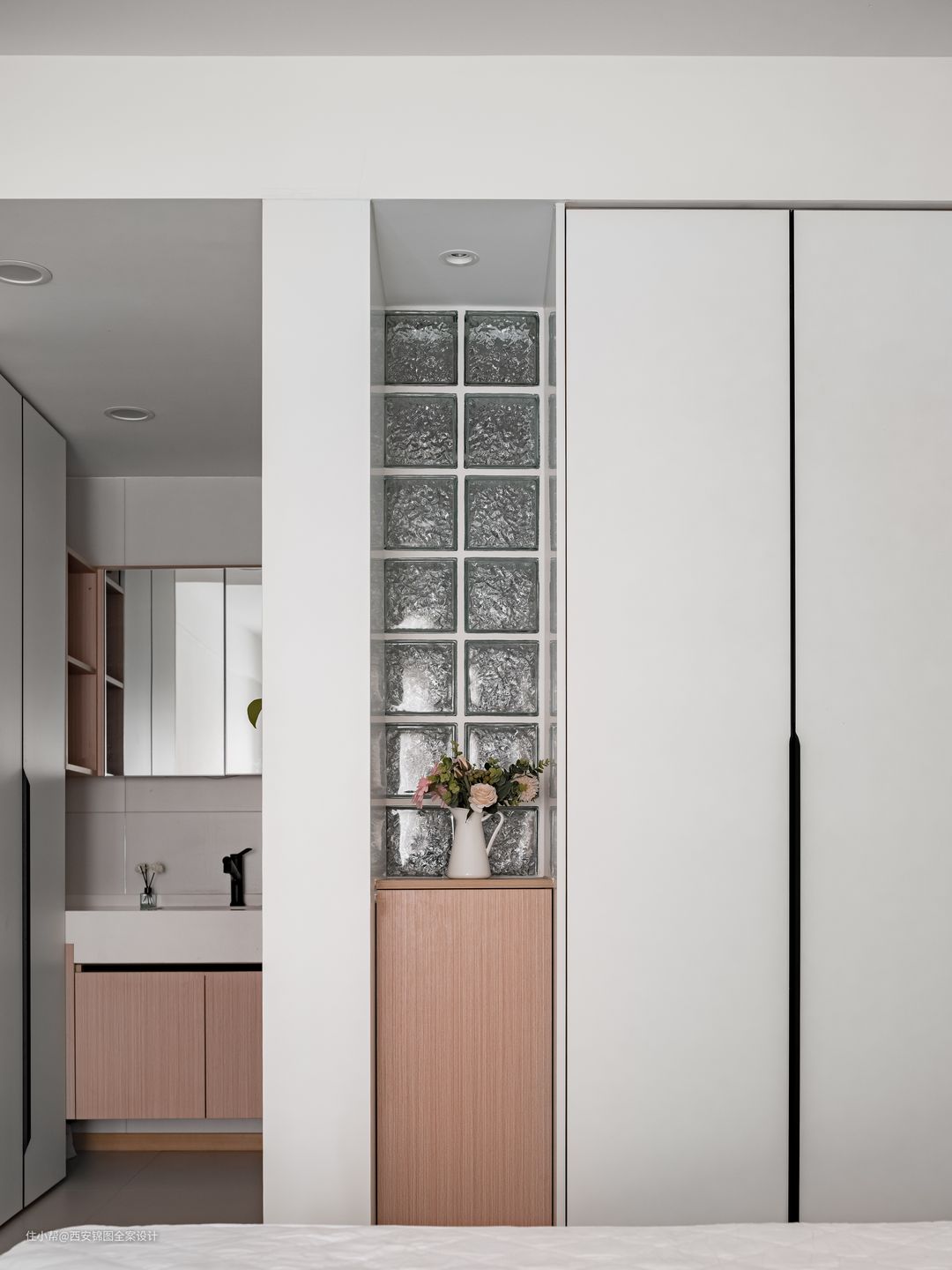 【设计亮点】 半开放式厨房,局部做折叠门,解决厨房狭小的问题 主卫洗手池外置,让狭小的卫生间也做到干湿分离不拥挤,大大提高空间利用率 通过墙面颜色及地砖抛光程度和灯光配合调节原始采光的不足 巧妙利用卫生间夹角制作壁龛,收纳洗漱用品