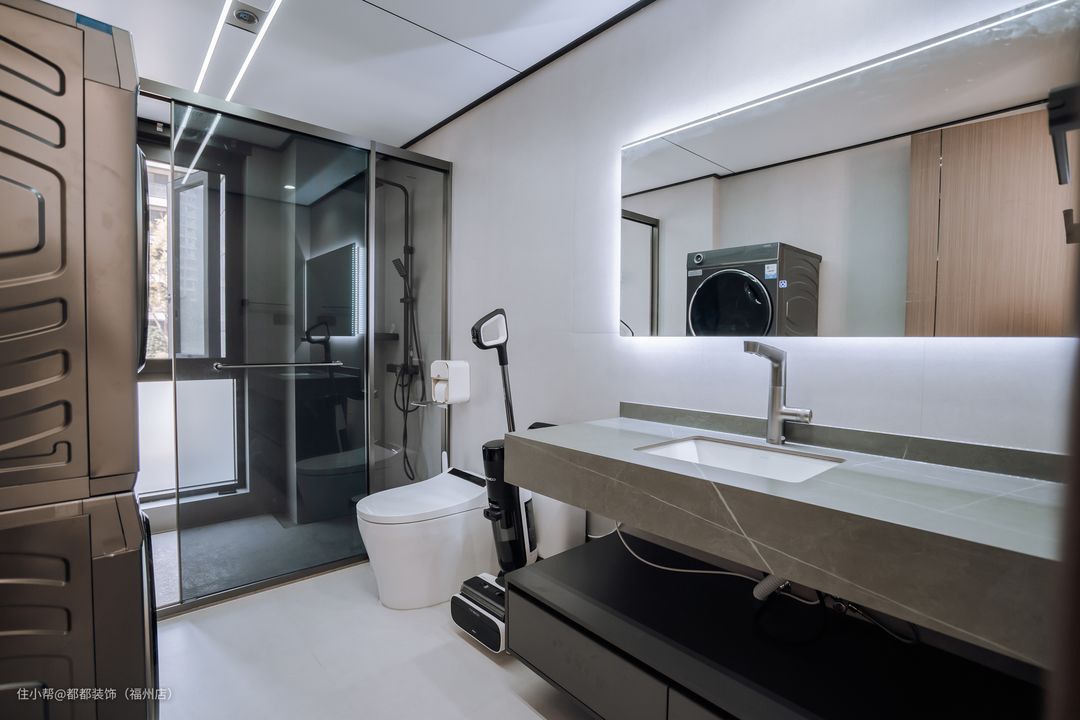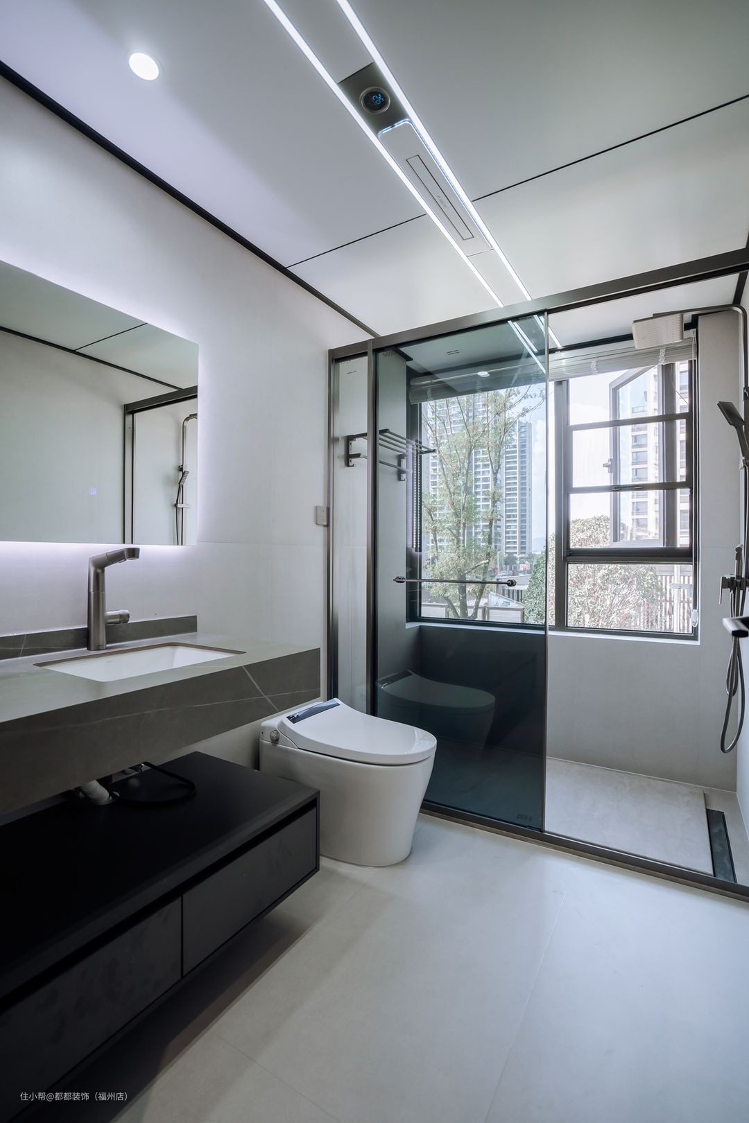 卫生间功能区分隔均匀而明确,全透明黑灰色玻璃门隔断干湿分区,实用性更强;整体是哑光白色,给人一种明亮又干净的感觉,简约而舒适。