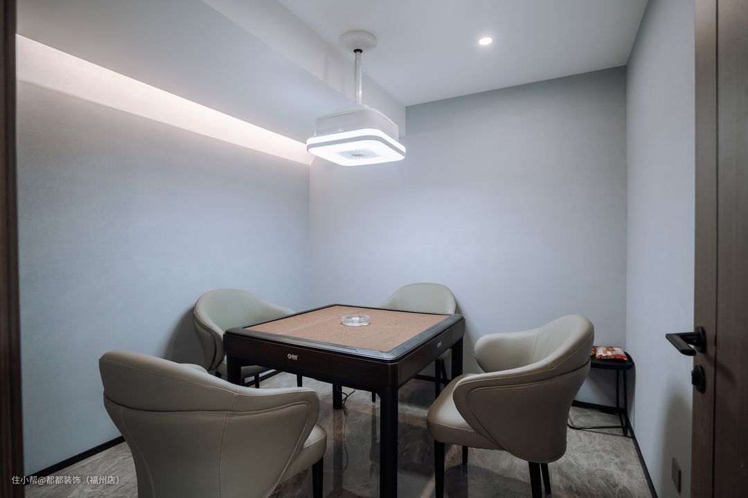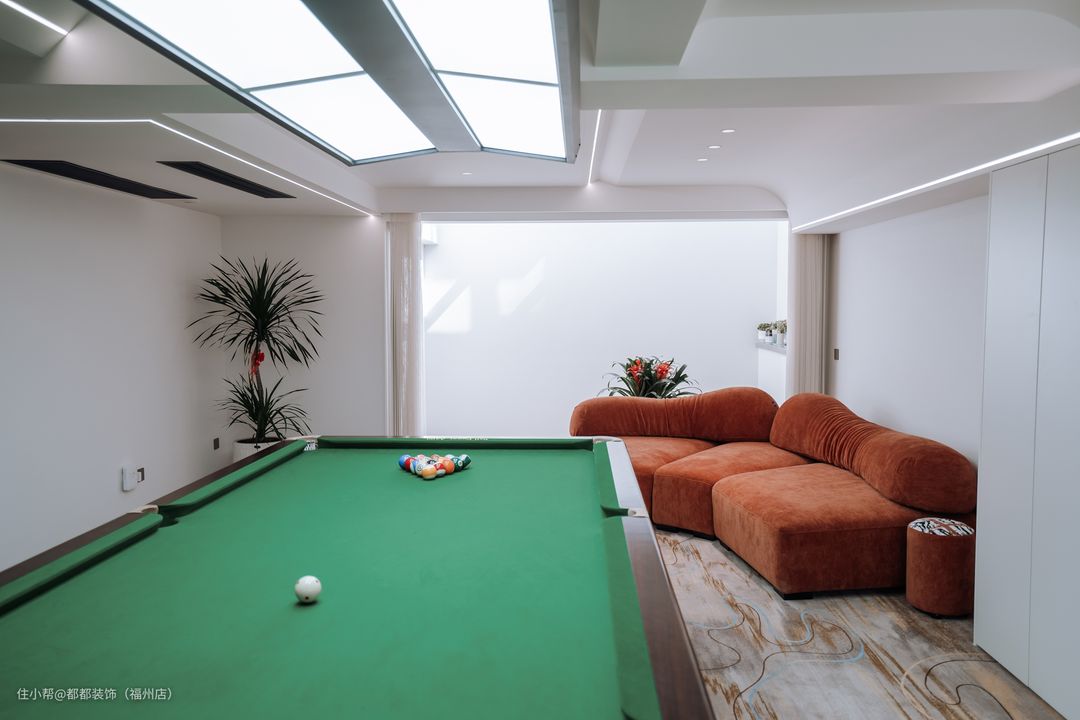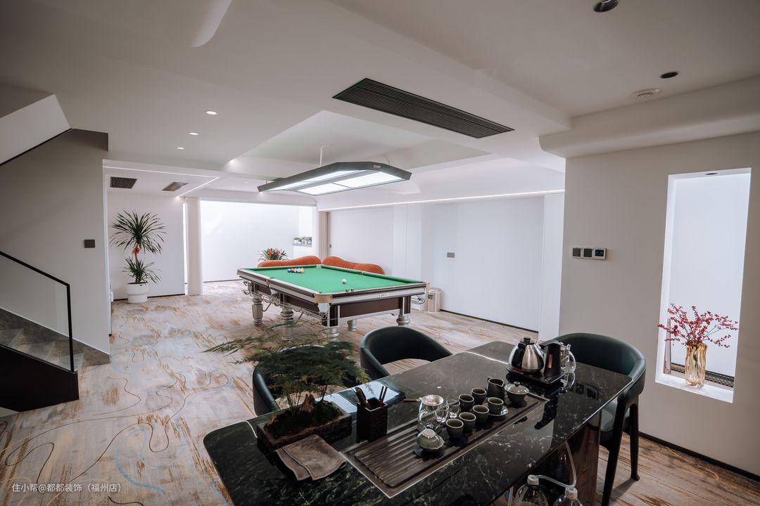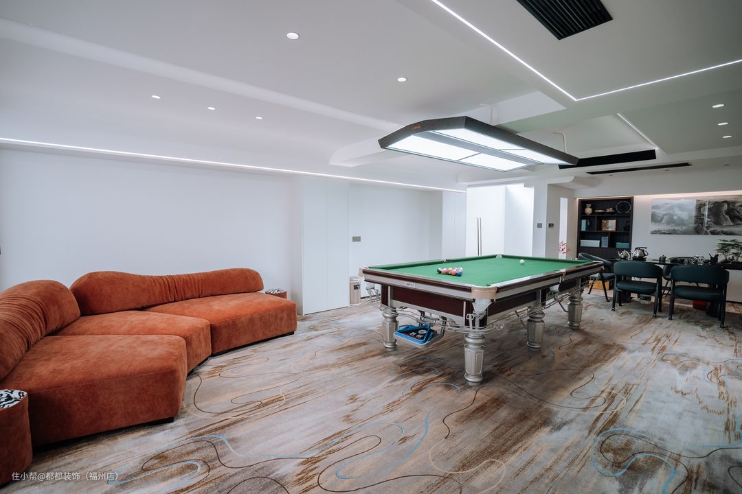 二楼的休闲区属于一个多功能区,既能够在这里看书喝茶、还能打台球娱乐又能储物收藏。 浅咖色的不规则绒面沙发复古质感满满,让空间显得更温暖,让人感觉非常舒适,越看越有味道! 另一边是麻将棋牌区域,周末休息时可以带朋友一起到活动区域畅聊玩耍,是一件快事!