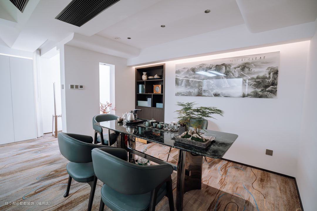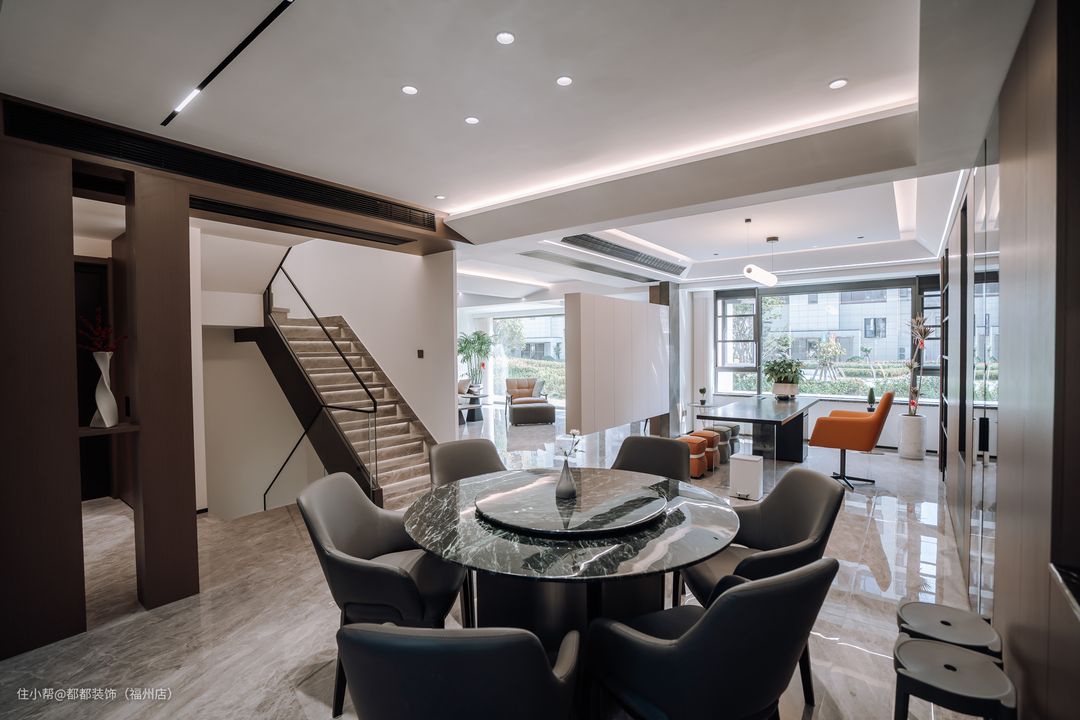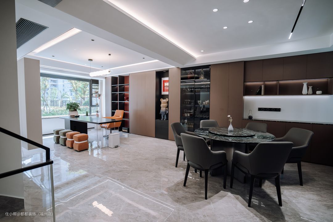 餐厅是直排式座椅设计,橙色的椅子和黑色的桌子更加具有视觉冲击。 储物餐边柜+餐桌一体设计这样一个全开放式的小小空间,就可以轻松实现餐厅、茶水间、交流等功能,让整个家的视野和氛围也相应得到改善。