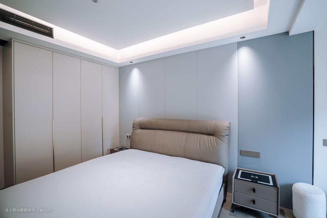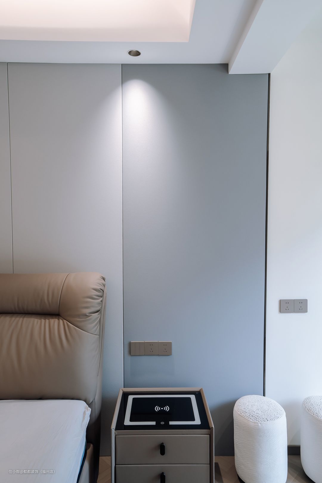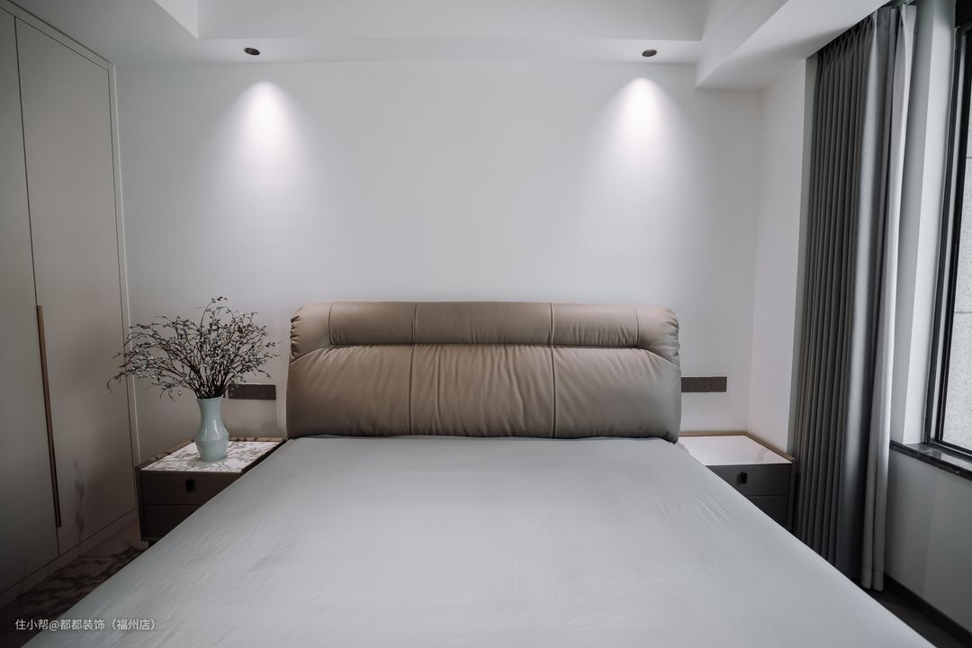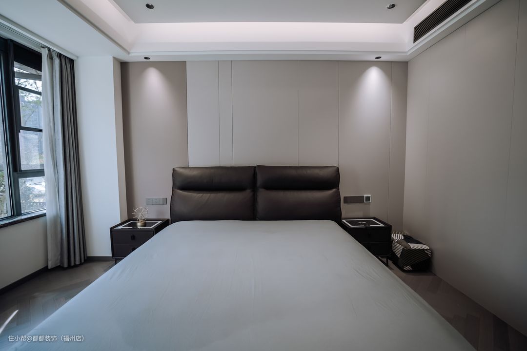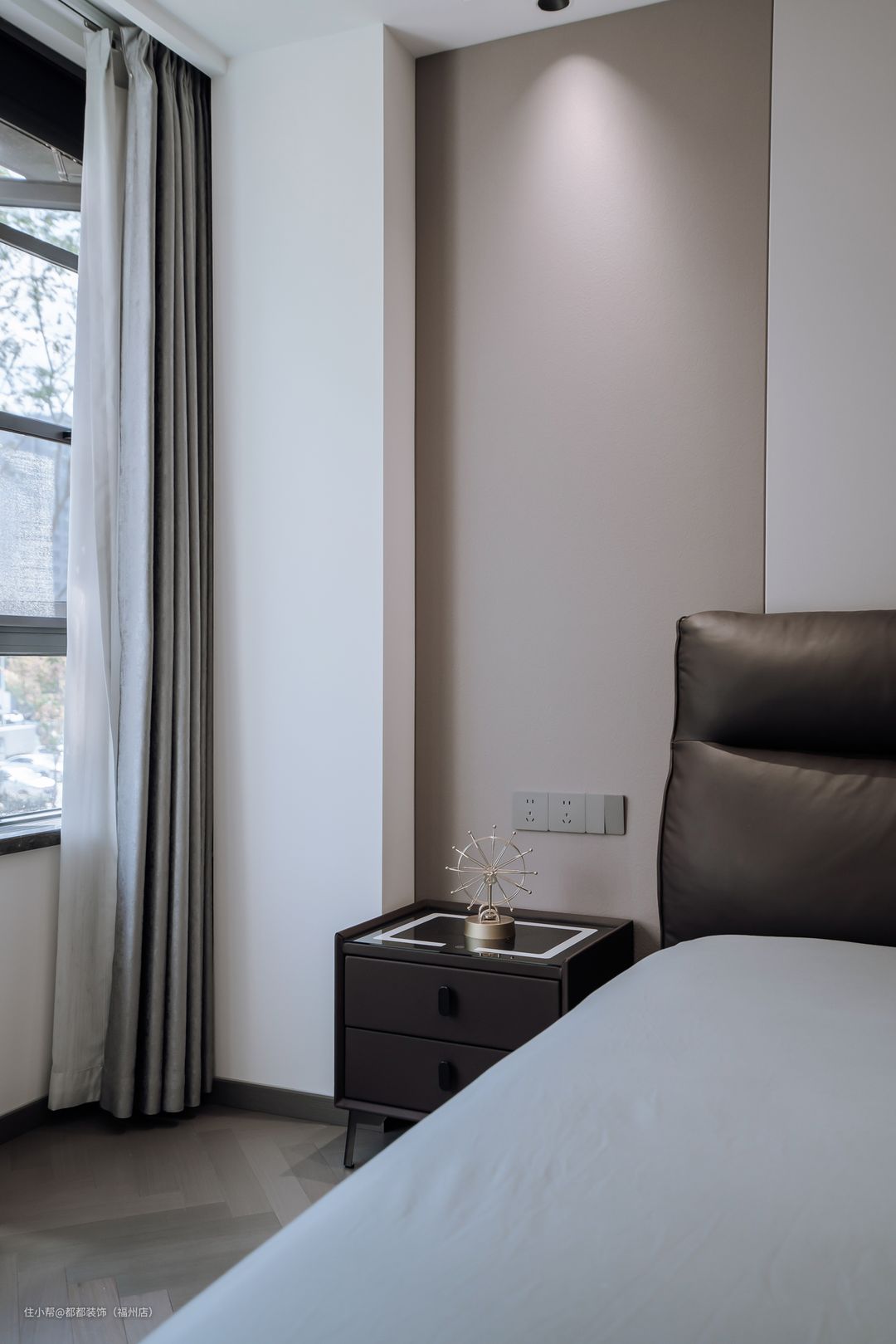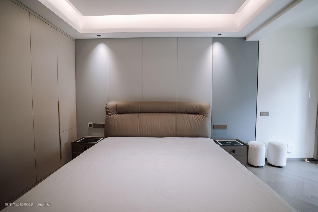主卧的配色是白、咖、灰的组合,静音地毯的加入让整个主卧提升档次,这是属于屋主独特的浪漫和生活。 床头柜保持同一色系,木质的家具质朴稳重,纯色床品中和家具色彩稳重却不沉重,呈现出一种慵懒感,营造静谧舒适的氛围。