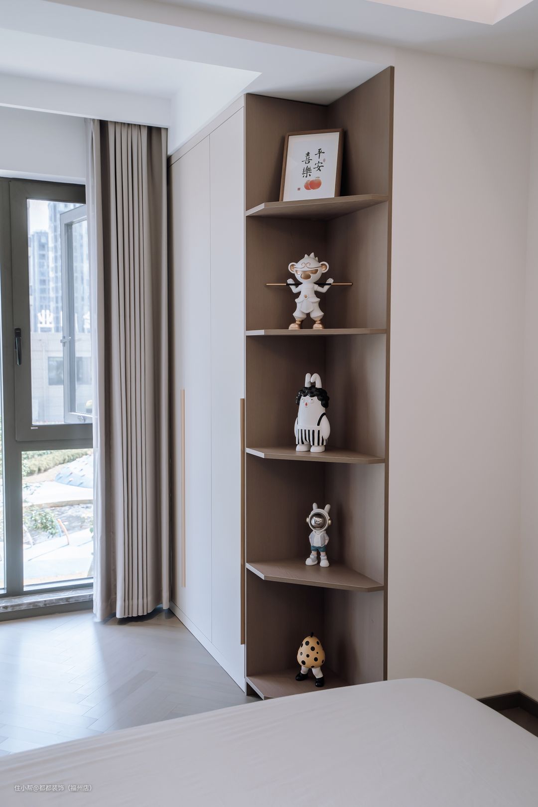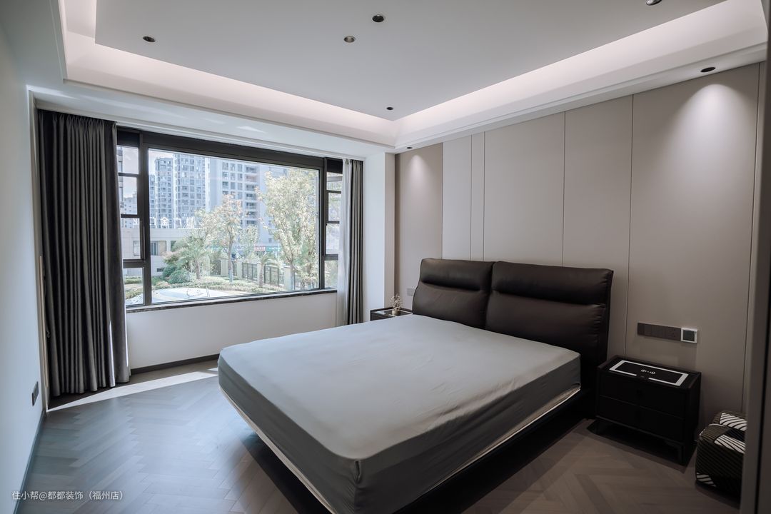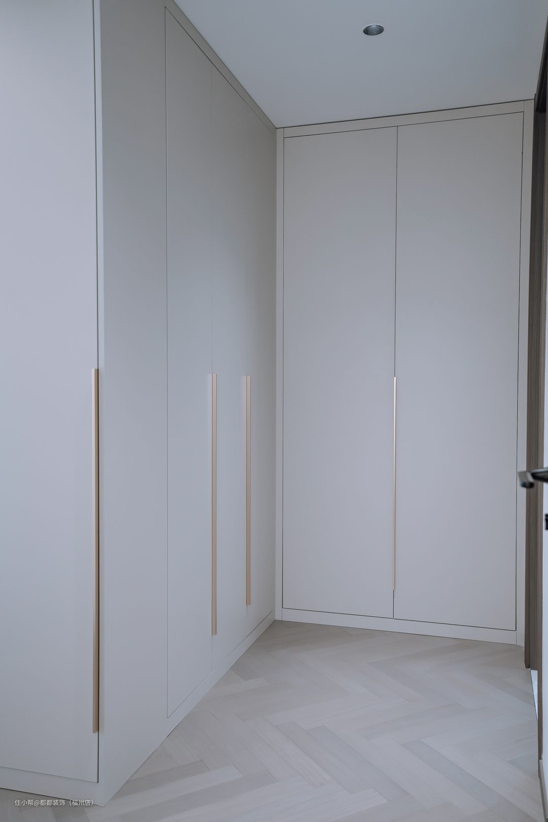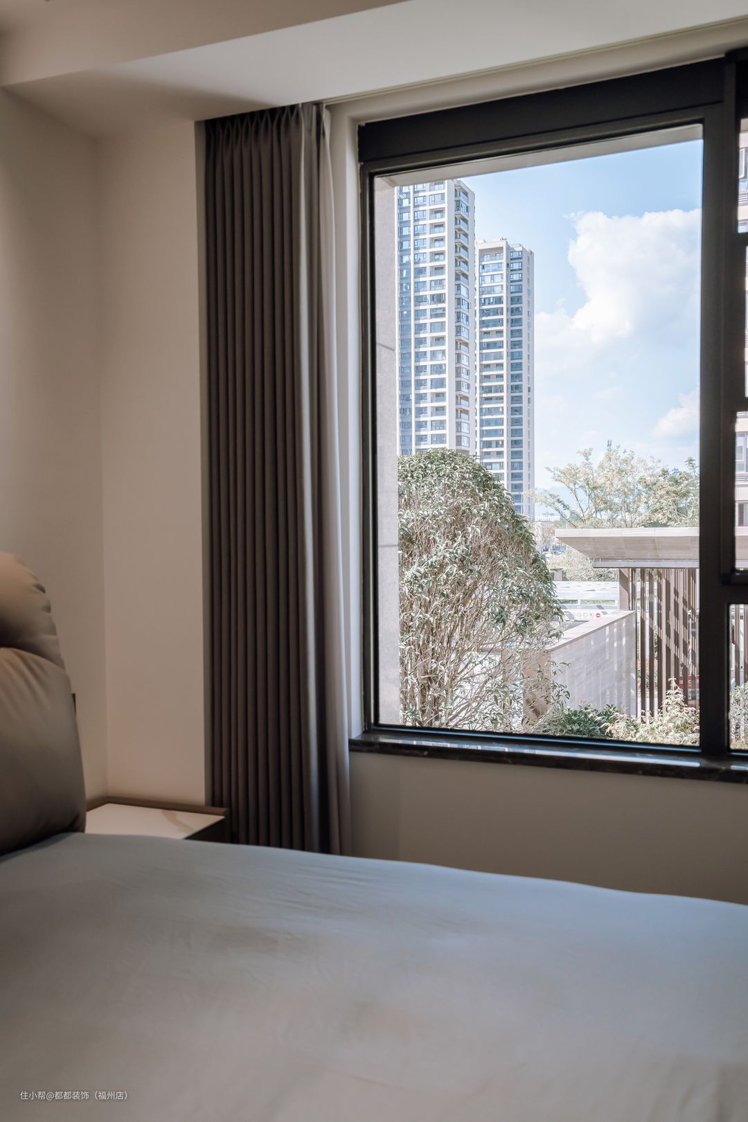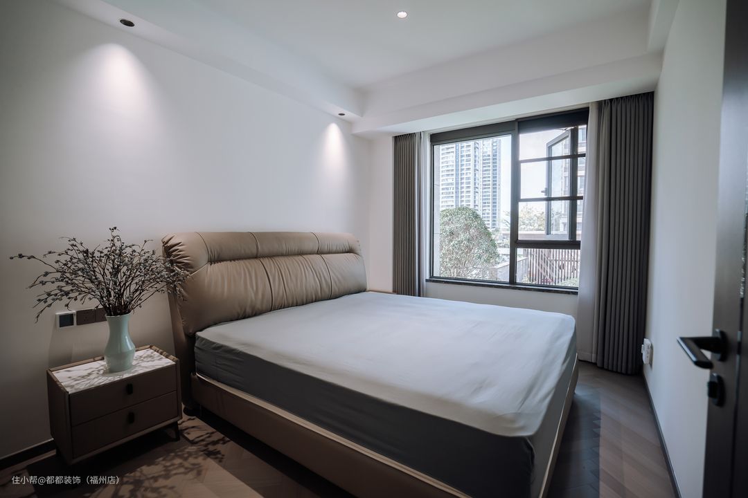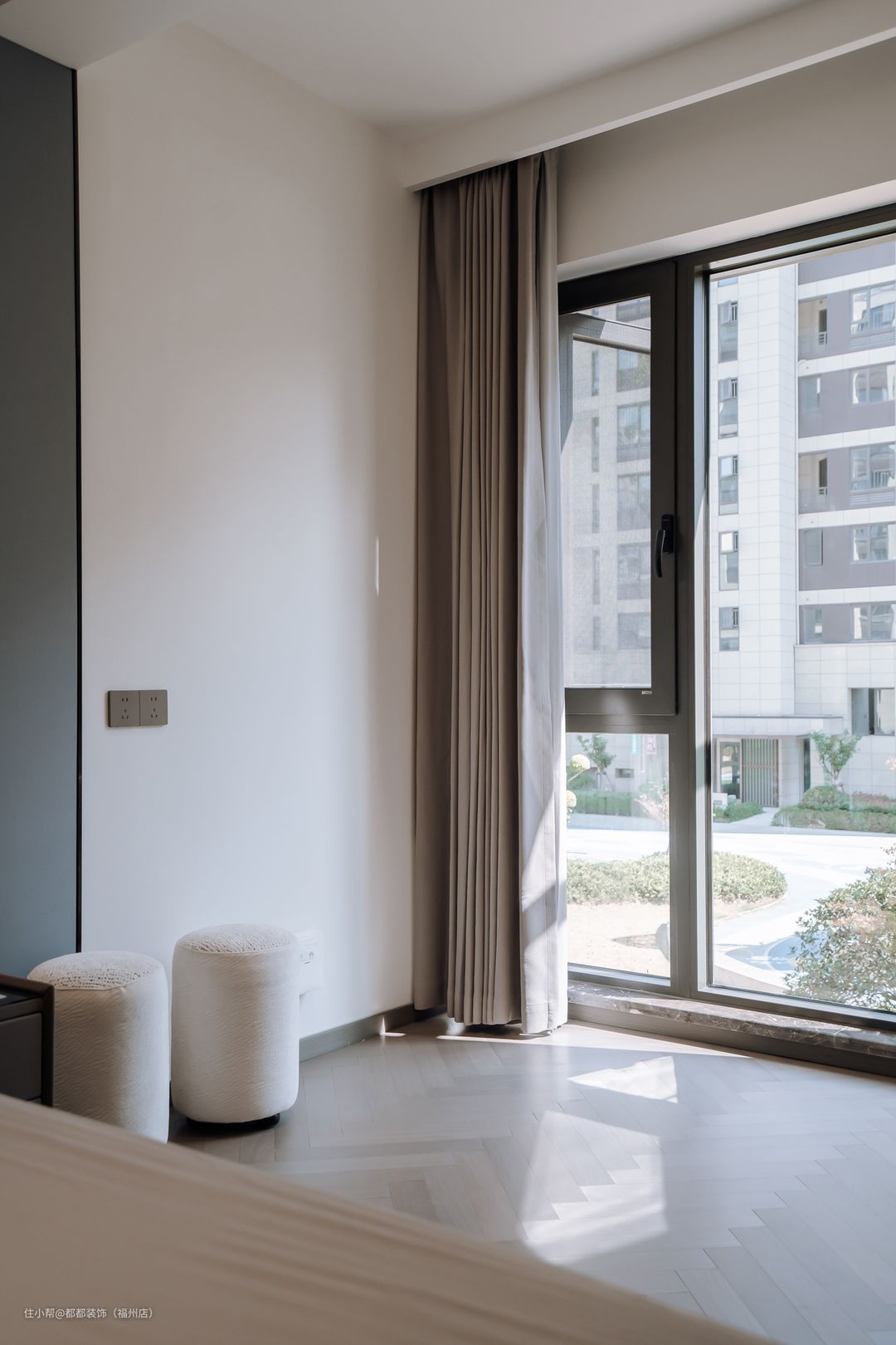 主卧的配色是白、咖、灰的组合,静音地毯的加入让整个主卧提升档次,这是属于屋主独特的浪漫和生活。 床头柜保持同一色系,木质的家具质朴稳重,纯色床品中和家具色彩稳重却不沉重,呈现出一种慵懒感,营造静谧舒适的氛围。