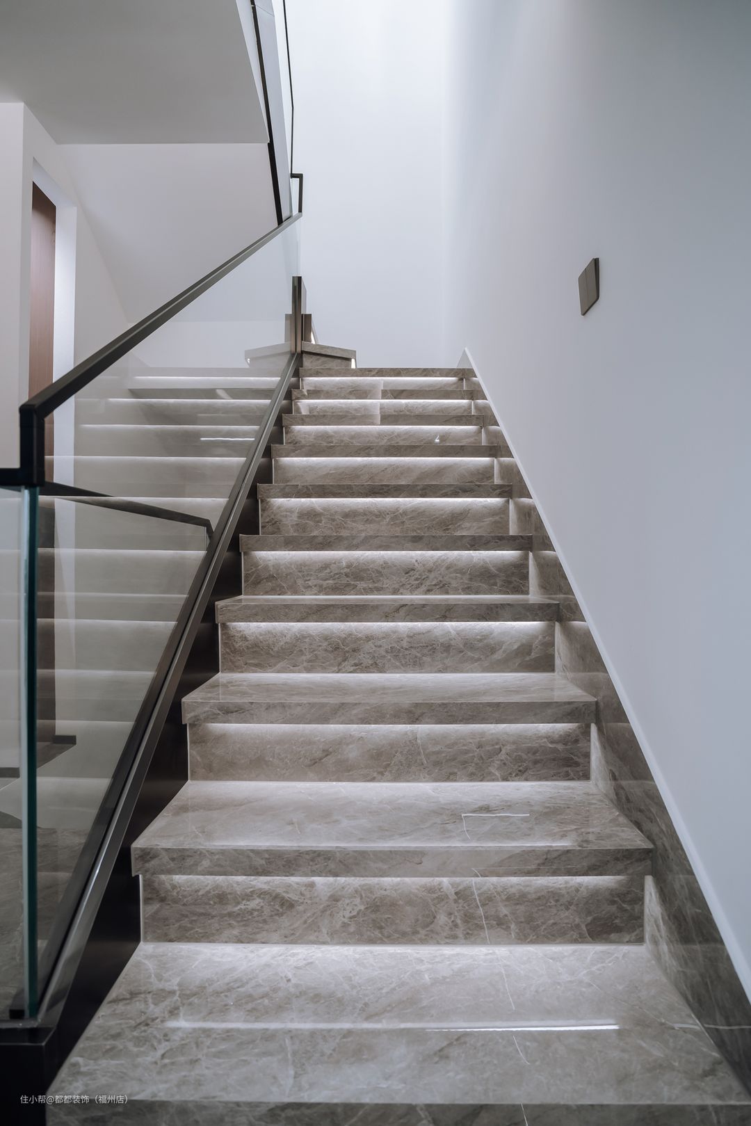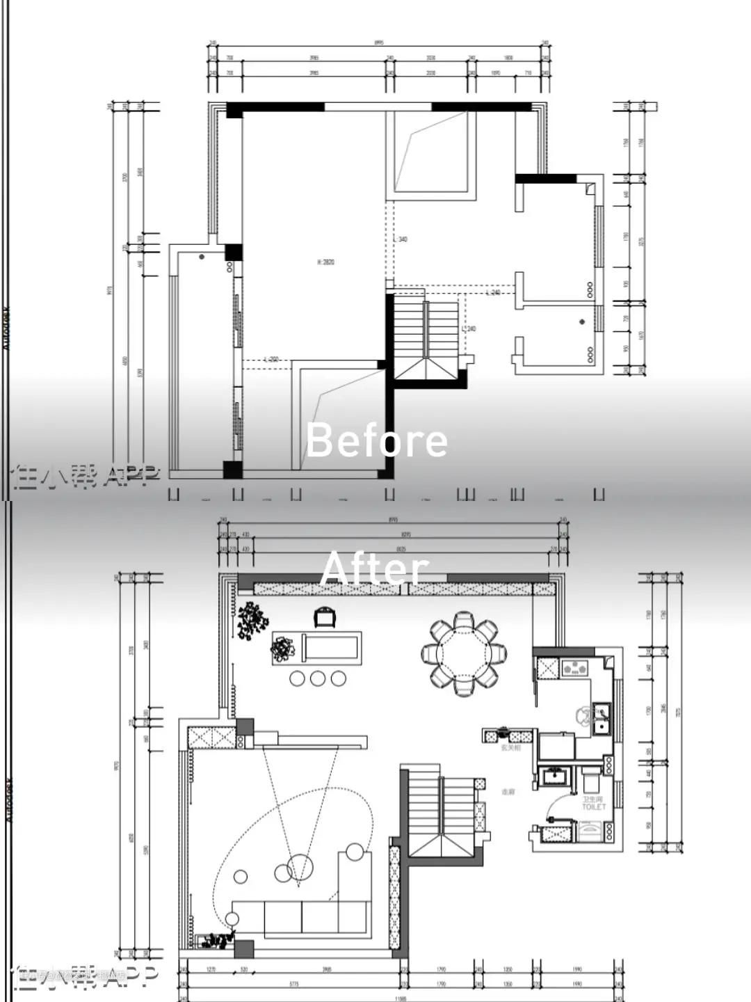 户型分析: 1.户型赠送面积较多,通风井打通后整体空间没有隔墙,需要重新布局; 2.入户门位置没有鞋柜,客卫空间较小,楼梯坡度较高; 3.负一层娱乐空间没有卫生间。 户型改造: 1.入户增加了穿插鞋柜,做了透光,增加了客卫和过道的采光, 2.开放式书房和餐桌做了贯通,餐厅区域飘窗位置拆除,增加收纳柜, 3.客厅悬浮电视墙,从沙发看向电视墙,半悬空的电视墙加持了客厅的纵深感,视觉上显得空间更有层次。 4.负一层增加了卫生间,同时也保留出台球桌和茶室的位置,又增加了一个棋牌室的空间 5.楼客卫较小,利用设备平台外扩,增加卫生间空间,让卫生间功能实现3等分。 主卧增加了一个L形衣帽间。