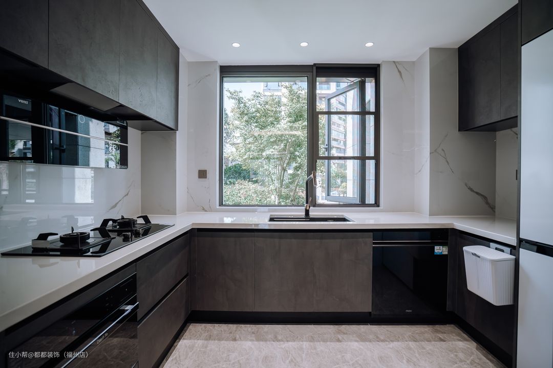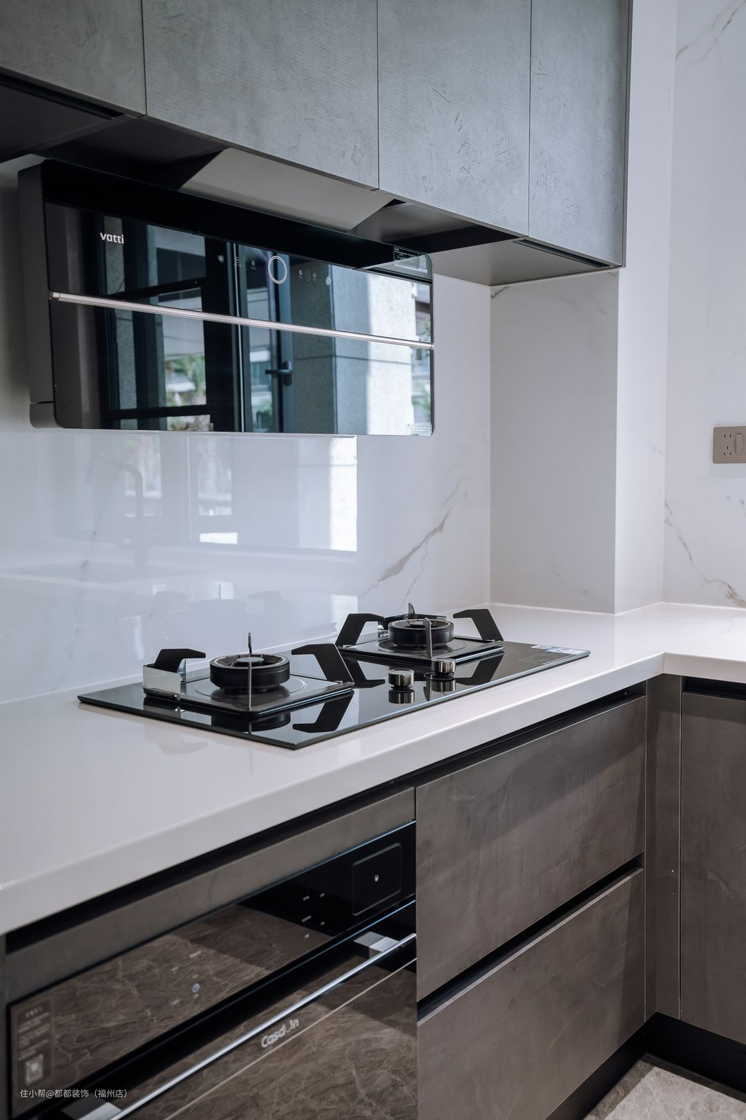 厨房面积宽敞,动线明确,整体呈现U型布局,灰色橱柜搭配整体色彩效果,显得整洁清爽,上下无把手橱柜的设计大大增加了储物空间,美观性和实用性兼具。