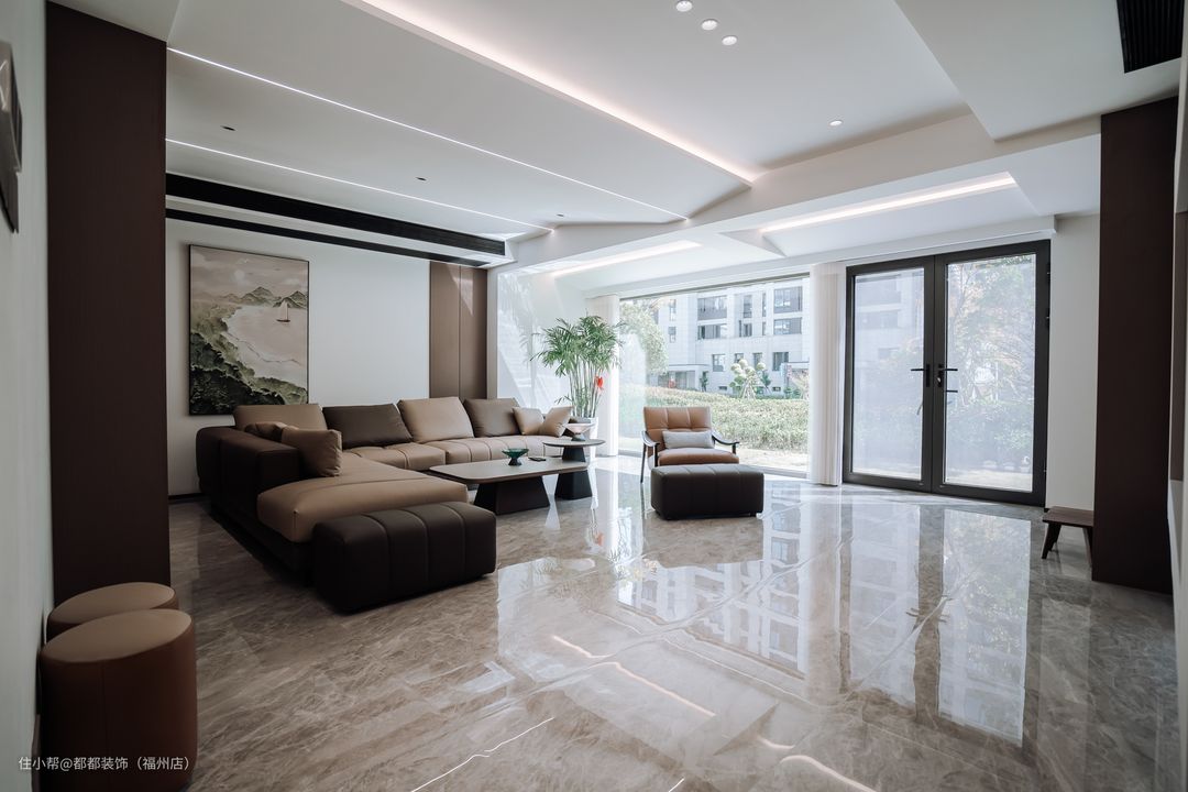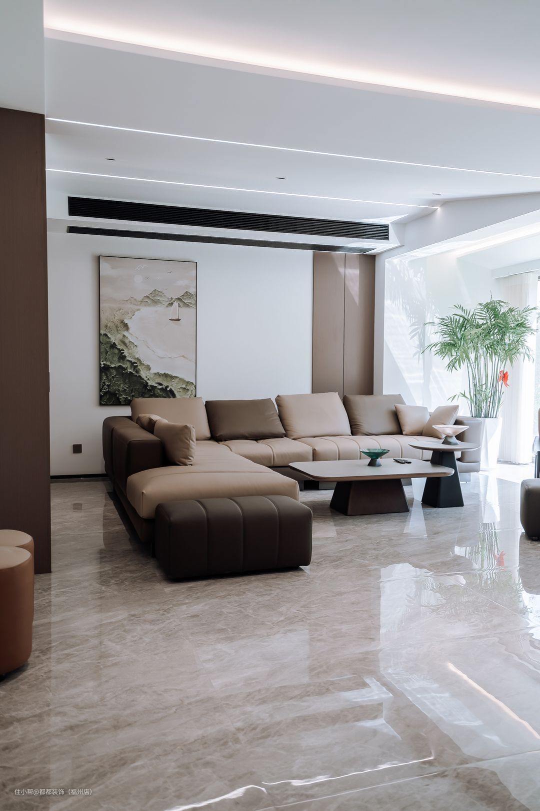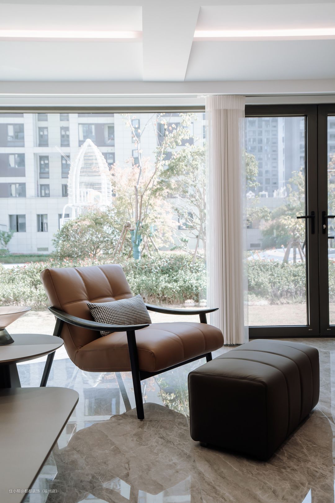客厅整体以咖色作为大面积的底色,背景墙利用白色咖色拼接做分色处理,让客厅不再单调的同时突出客厅的层次感,跳脱的色彩不仅保留了客厅清爽视线,还让空间更加有趣味性。 客厅是整体布局上通透流畅,藉由沉稳的咖色引申出自然朴质意趣。 哑光皮面的沙发很有中古的味道,越用越有韵味,皮革迷人的质感自带一种怀旧与复古感,在繁忙枯燥的现代生活中,给我们增添了浪漫复古的情调。 在大大的落地窗前摆放舒适的哑光皮质椅,因为现代家居追求的简约,流畅的家具让整体风格更加的简练又不失丰富的品味,令人回味悠长。 客厅的落地窗让整个屋子内部充满了阳光的味道,让家与自然相互连接,亲切也温馨。 对电视墙没有过多收纳需求的,做成悬浮电视墙设计,让空间拥有漂浮感。转角空出一个过道,如此一来,整体造型不会显得生硬呆板,也多了一份温柔力量,空间瞬间有了呼吸感,不显得局促。