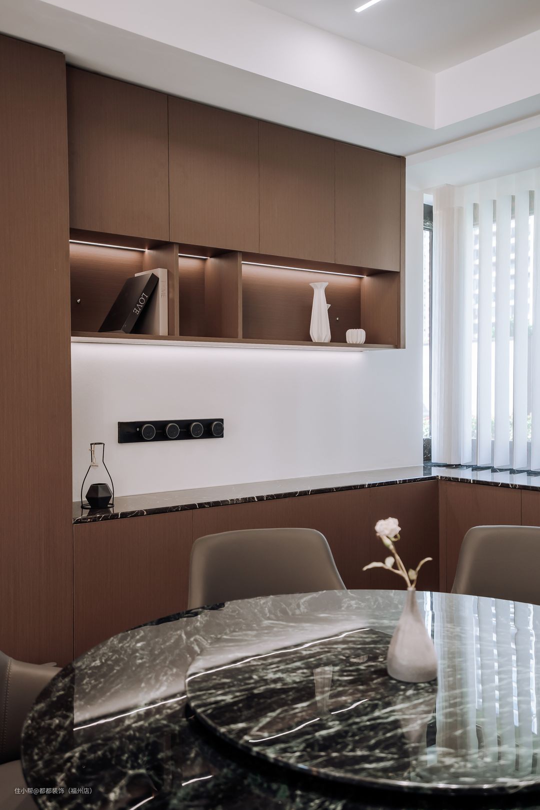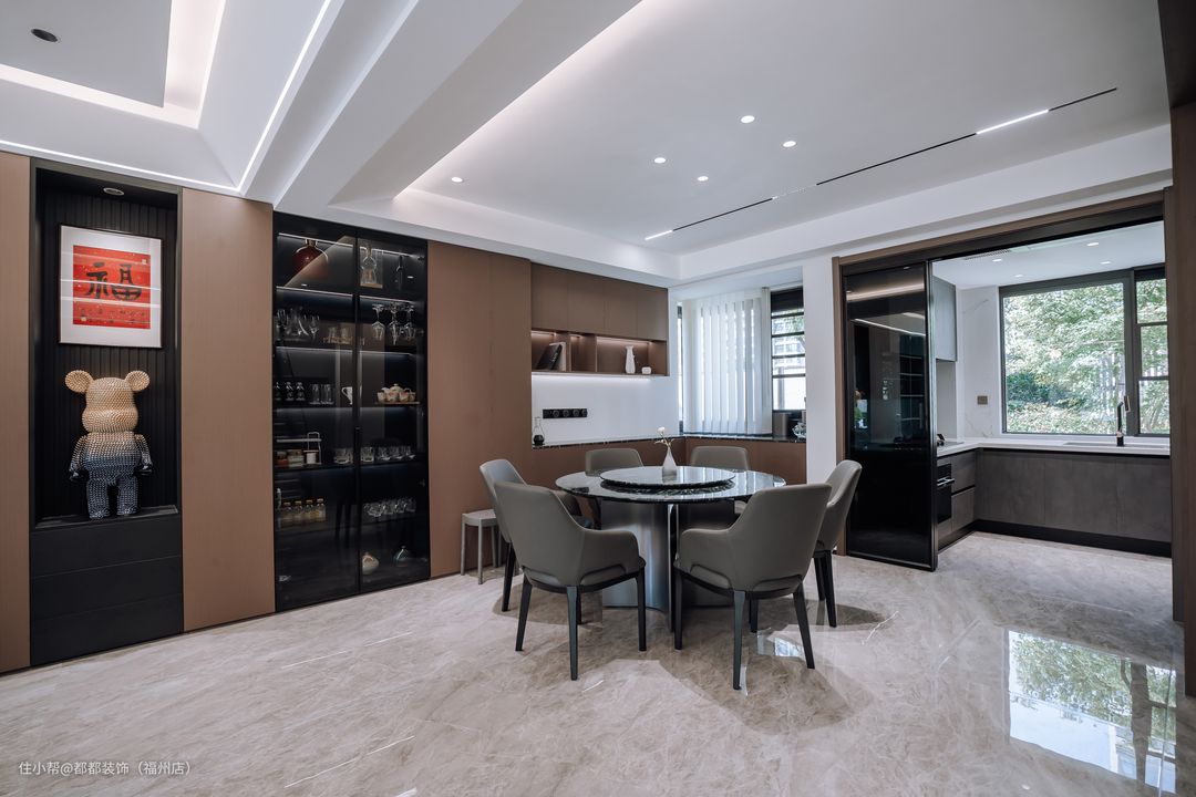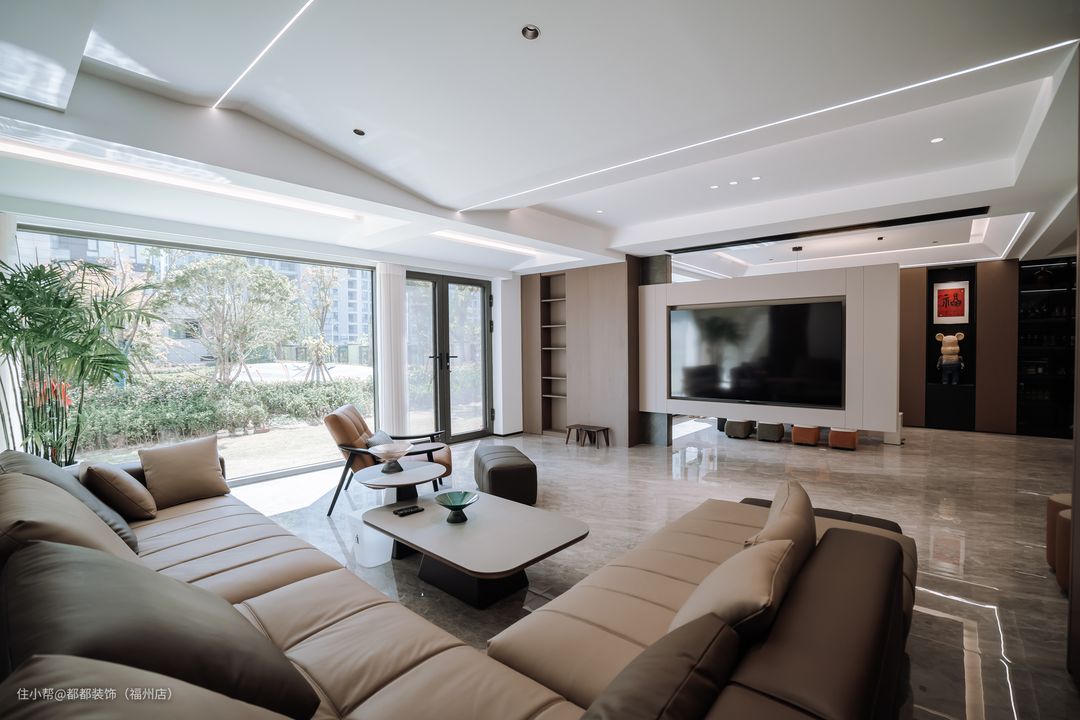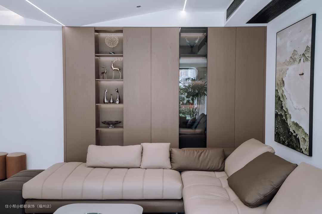 客厅整体以咖色作为大面积的底色,背景墙利用白色咖色拼接做分色处理,让客厅不再单调的同时突出客厅的层次感,跳脱的色彩不仅保留了客厅清爽视线,还让空间更加有趣味性。 客厅是整体布局上通透流畅,藉由沉稳的咖色引申出自然朴质意趣。 哑光皮面的沙发很有中古的味道,越用越有韵味,皮革迷人的质感自带一种怀旧与复古感,在繁忙枯燥的现代生活中,给我们增添了浪漫复古的情调。 在大大的落地窗前摆放舒适的哑光皮质椅,因为现代家居追求的简约,流畅的家具让整体风格更加的简练又不失丰富的品味,令人回味悠长。 客厅的落地窗让整个屋子内部充满了阳光的味道,让家与自然相互连接,亲切也温馨。 对电视墙没有过多收纳需求的,做成悬浮电视墙设计,让空间拥有漂浮感。转角空出一个过道,如此一来,整体造型不会显得生硬呆板,也多了一份温柔力量,空间瞬间有了呼吸感,不显得局促。
