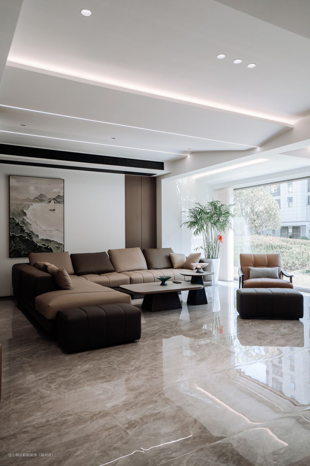 客厅整体以咖色作为大面积的底色,背景墙利用白色咖色拼接做分色处理,让客厅不再单调的同时突出客厅的层次感,跳脱的色彩不仅保留了客厅清爽视线,还让空间更加有趣味性。 客厅是整体布局上通透流畅,藉由沉稳的咖色引申出自然朴质意趣。 哑光皮面的沙发很有中古的味道,越用越有韵味,皮革迷人的质感自带一种怀旧与复古感,在繁忙枯燥的现代生活中,给我们增添了浪漫复古的情调。 在大大的落地窗前摆放舒适的哑光皮质椅,因为现代家居追求的简约,流畅的家具让整体风格更加的简练又不失丰富的品味,令人回味悠长。 客厅的落地窗让整个屋子内部充满了阳光的味道,让家与自然相互连接,亲切也温馨。 对电视墙没有过多收纳需求的,做成悬浮电视墙设计,让空间拥有漂浮感。转角空出一个过道,如此一来,整体造型不会显得生硬呆板,也多了一份温柔力量,空间瞬间有了呼吸感,不显得局促。