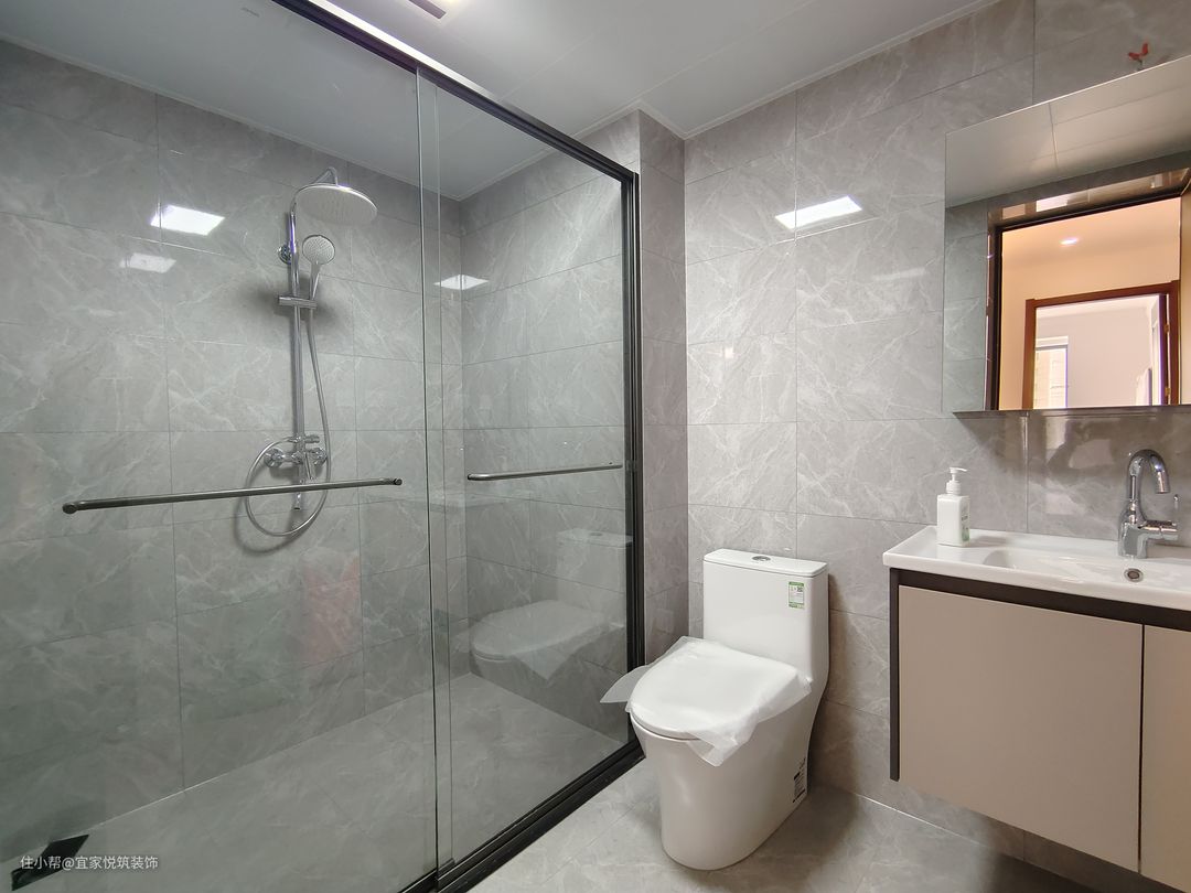卫生间淋浴区选择用玻璃浴屏 做干湿分离。这样业主洗澡完毕。 整体卫生间也会很干爽。