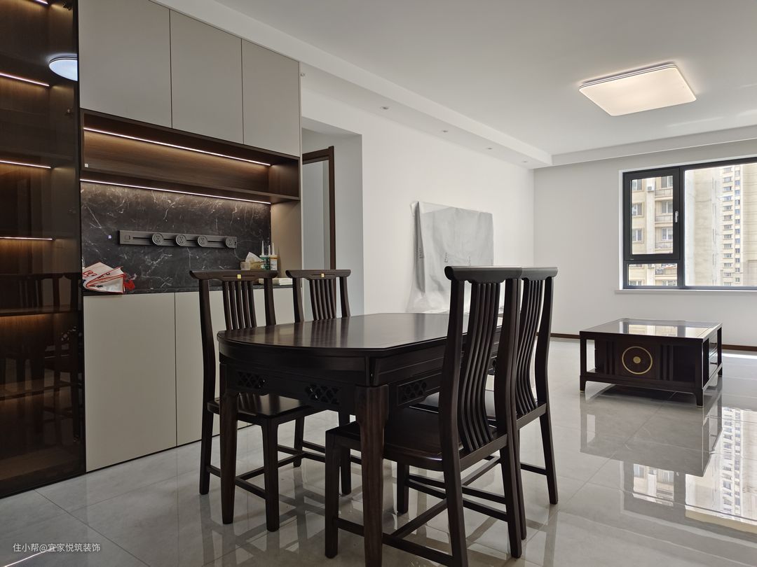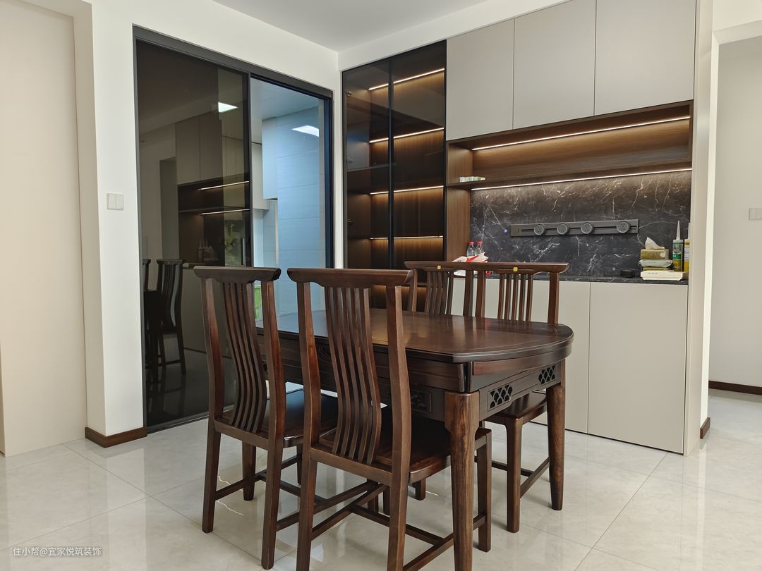 原有公共区域收纳能力不足 , 在不影响餐厅用餐区的情况下,增加一组餐边柜 既能增加收纳也能起到装饰作用