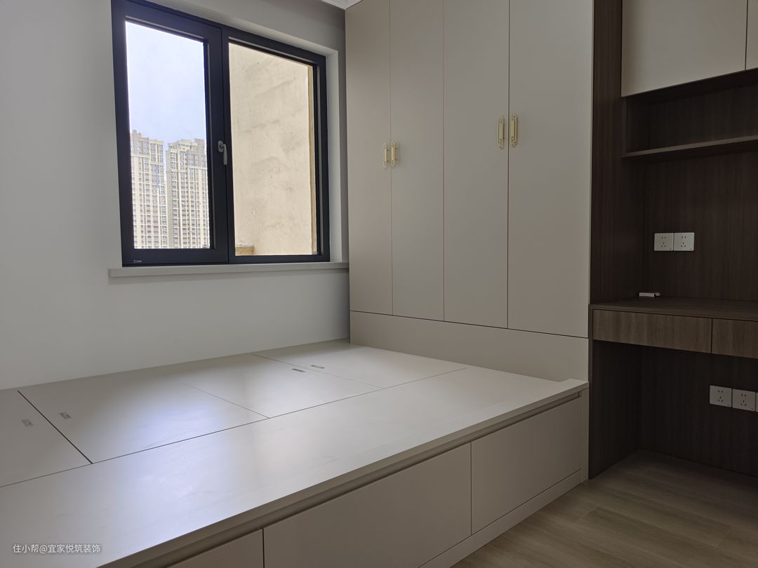 次卧室选择做整体定制榻榻米 ,由于次卧面积有限 无法满足收纳睡觉及办公。 定制榻榻米可以完美解决。