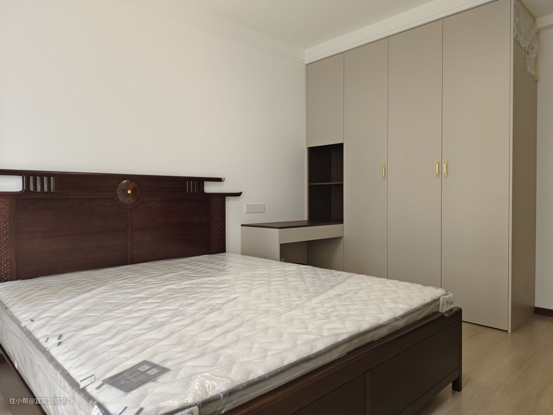 主卧室以居住舒适为主,没有复杂的造型及吊棚。整体颜色还是以暖色为主。 业主还要求放置梳妆台 我们在定制衣柜处做了连体梳妆台,又节省空间 还不影响衣柜收纳,