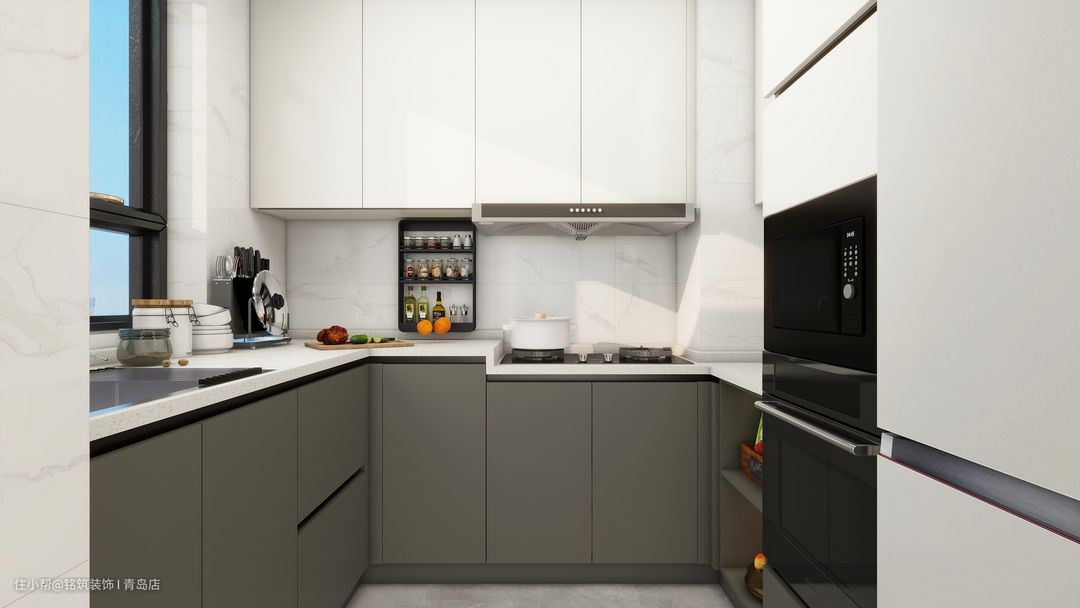 厨房采用L型的设计,将烹饪区和洗菜区剥离,更好的进行作业。上下橱柜的打造让小小的厨房,有了更多收纳空间,更好的利用了空间,擦启用两种配色,避免了审美疲劳。