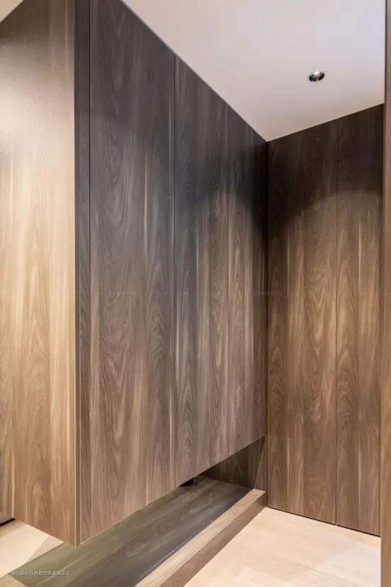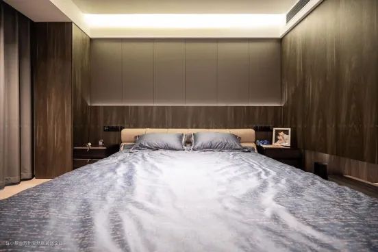 🆕床头半墙和两边衣柜统一材质色调,用内嵌灯带和墙顶的灯带呼应,制造卧室的立体感,又在深浅色对比中减轻衣柜带来的厚重感,这个床头灯光设计好赞! 🆕随着北次卧改成衣帽间被纳入套房区域,主卧更显宽敞舒适。这里的转角做了斜切处理,动线流畅,储物颜值两手抓。