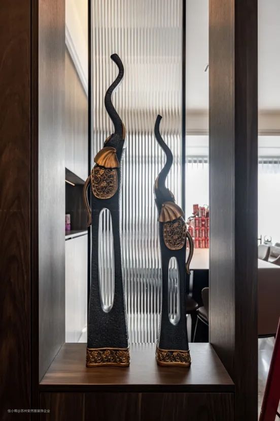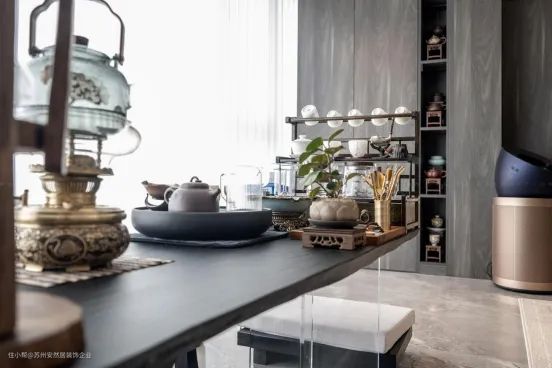 ♥平面方案布局改善: 1️⃣.紧靠客厅的南次卧拆除后,做成时下最流行的横厅设计,阳台移门也一道拆除三开间阳台一分为二,一部分作为儿童房,一部分除了保留功能阳台外,安置业主最想要的茶室;北次卧,直接改做衣帽间划入主卧,完善主卧套房功能区,住起来舒适又宽敞。 2️⃣.原本入户旁就是儿童房的门,有些紧促,现在儿童房舍弃这一小区域,重开一道门,入户过道处瞬间开阔不少,玄关的功能更完善,儿童房也变得更加方正。 3️⃣.将餐厅移到客厅后,原来餐厅区域划给厨房,沿着u型厨房操作台打造一个L型小吧台,方便置物,用个简餐,厨房餐厅都不拥挤了。