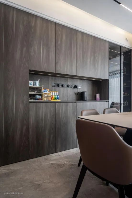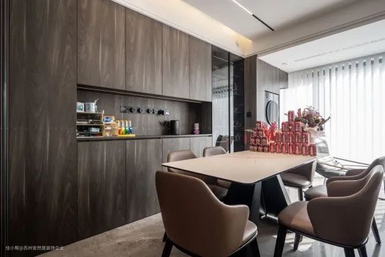 🆕原本只能4人位的小餐厅,挪了位置后足足6人位也不觉得拥挤,饰面板全包围的感觉直通到阳台区域,整体空间统一、开阔、明朗~