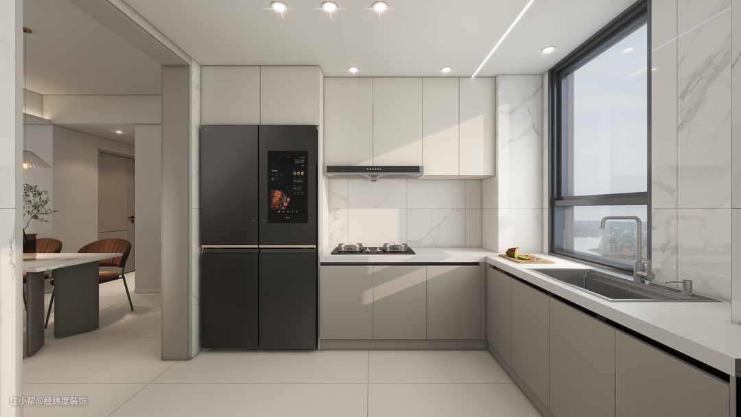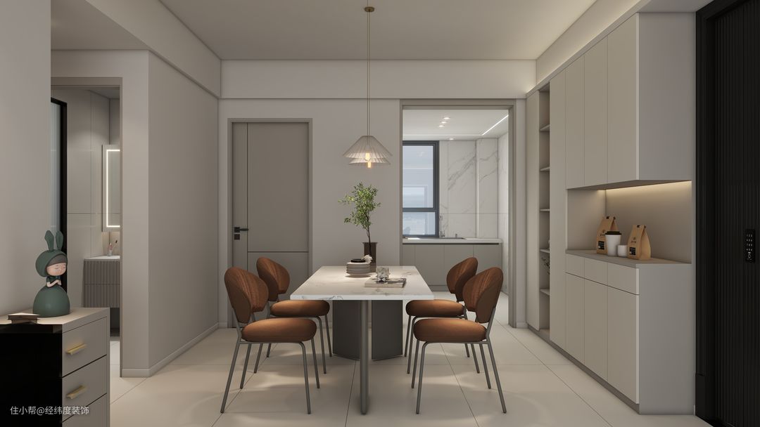 餐厅与客厅连接在一起,增加互动。采用客餐厅一体布局,将公共区域全部打通,透光性良好,让整体空间通透清爽。 视觉效果上更加开阔。随着场景动线变化,逐渐过渡不同生活场景,既承载家一日三餐,柔和进记忆里的亲密情绪。