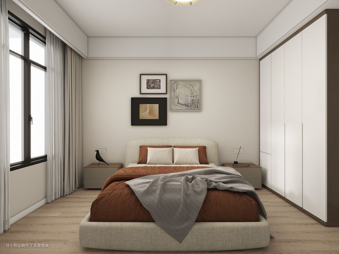 主卧床头背景墙采用了米咖色和红棕色的撞色设计,中间黑色线条进行上下分割,搭配黑框复古装饰画,增添了空间的艺术气息。1.8米胡桃木质羊羔绒布艺床,整体质感柔和,搭配浅色多层实木木地板,营造出温馨宁静的睡眠环境。衣柜采用白色亮面柜门,和木饰面床头柜穿插设计,设计简洁大方,为空间提供充足的收纳。床头柜和装饰物选用深木色,与墙面形成对比,突出整体设计的层次感。窗户配有双层窗帘,既能调节光线,又能保护隐私。