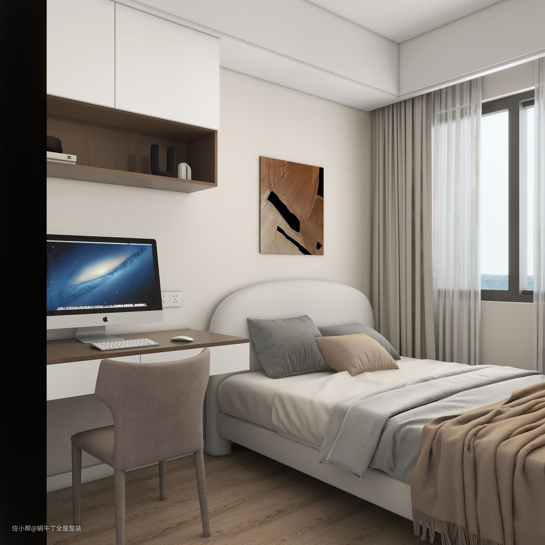 书桌和上方的开放式储物柜采用深木色柜体和白色亮面柜门,提供了整洁的办公空间和充足的收纳空间。床头背景墙挂有一幅抽象装饰画,增加了空间的艺术气息。1.5米白灰色布艺床,搭配灰色和米色的枕头和被子,营造出温馨舒适的氛围。浅色木质地板为空间注入了自然气息,提升了整体的温馨感;奶油风花瓣泡泡吸顶灯,提供均匀柔和的照明,适合儿童活动和阅读;整体设计通过简洁的线条和柔和的色调,打造出一个既现代又实用的多功能卧室。