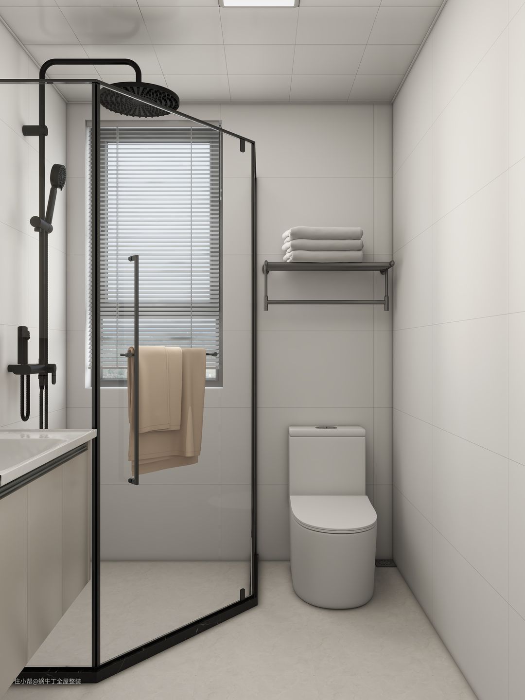 黑色的淋浴设备与白色背景形成鲜明对比,增加了设计的层次感和现代感。