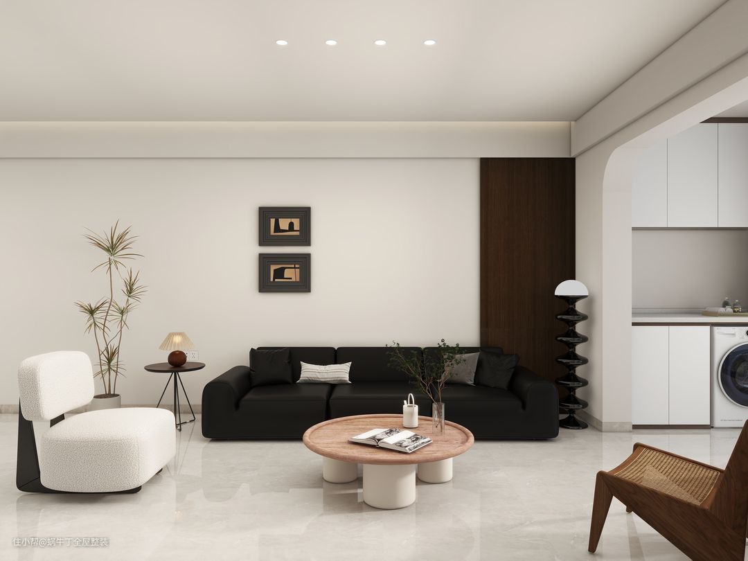 客厅整体以米咖色调为主,置入少量胡桃木色元素;电视背景一字型悬浮电视柜,搭配简单的几何形体,简洁而又具细节;沙发背景使用深棕色护墙板和结合米咖色乳胶漆设计,增加空间的层次感;客厅2.8米黑色真皮沙发,搭配白色羊羔绒单椅和昌迪加尔藤编椅、金属胡桃木边几、白蜡木圆几,黑色落地灯,为空间营造出舒适温馨的氛围。800*800卡迪灰大理石瓷砖,与整体风格呼应,同时便于清洁和维护。