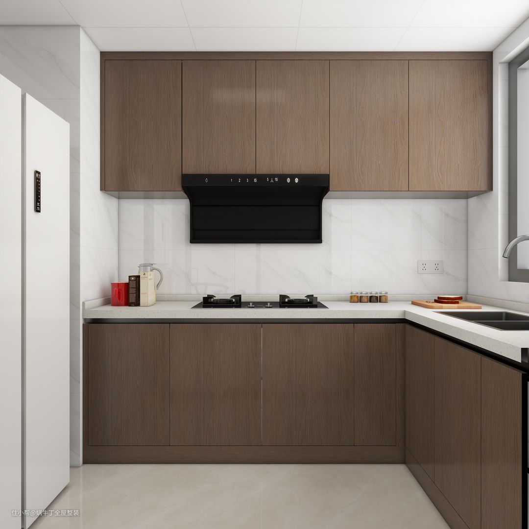 L型的操作台布局合理,方便用户进行各类烹饪活动。现代化的厨房设备,嵌入式抽油烟机和燃气灶,提高了烹饪效率。800*800卡迪灰大理石瓷砖搭配白色大理石墙砖,防水防油污,易于清洁,提升厨房明亮感;深木色地柜+高斯白石石英石台面,提供大量的储物空间,更加耐脏易于清洁;深木色吊柜,美化油烟机设备,方便存放厨房用品,保持整洁。