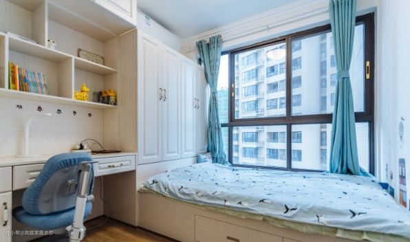 次卧是儿童房,考虑到面积不是很大,于是就根据业主一家人的需求做了榻榻米组合衣柜书桌一体式的设计,同时也满足了孩子的学习区需求。 定制的柜子,收纳能力杠杠的。整体蓝色的搭配,用清新明亮的色彩提升视觉饱和度,也符合小朋友的喜好。
