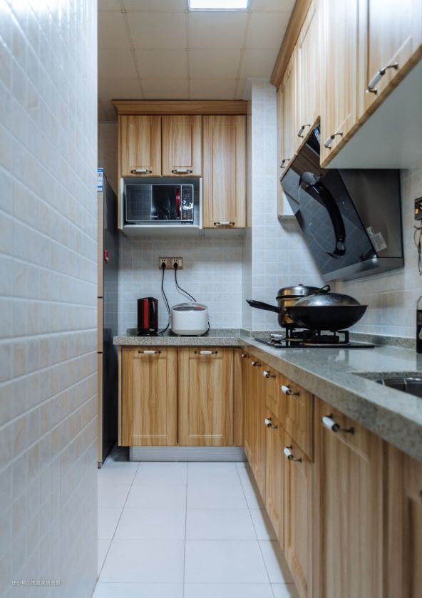 根据厨房户型做了L型的布局,虽然面积不是很大,但是各个功能区划分明确,使用也方便。靠门边预留出足够的空间用来摆放冰箱,合理布局。 简约白色的瓷砖通铺墙地面,跟原木色的橱柜做了色彩上的对比,丰富了视觉效果。纯粹清新的色彩融合,也让家更具温馨氛围感。