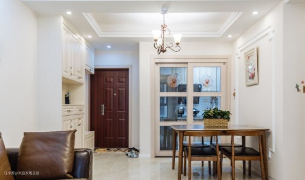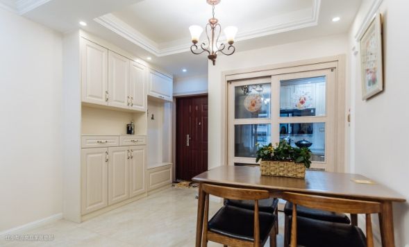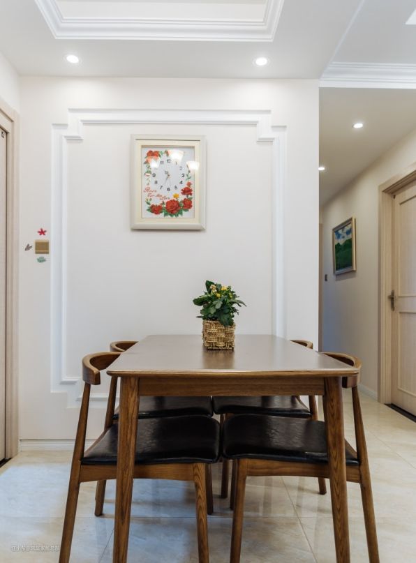 入户将鞋柜与餐边柜结合,定制的顶天立地柜子,靠门边搭配上一体式的换鞋凳,方便进出门使用。柜子中间留空,方便日常储物。 餐厅背景墙跟客厅的设计一致,延用了石膏线条的造型,立体感十分强。搭配上深色的实木餐桌椅,色彩的碰撞下,有效提升了层次感。