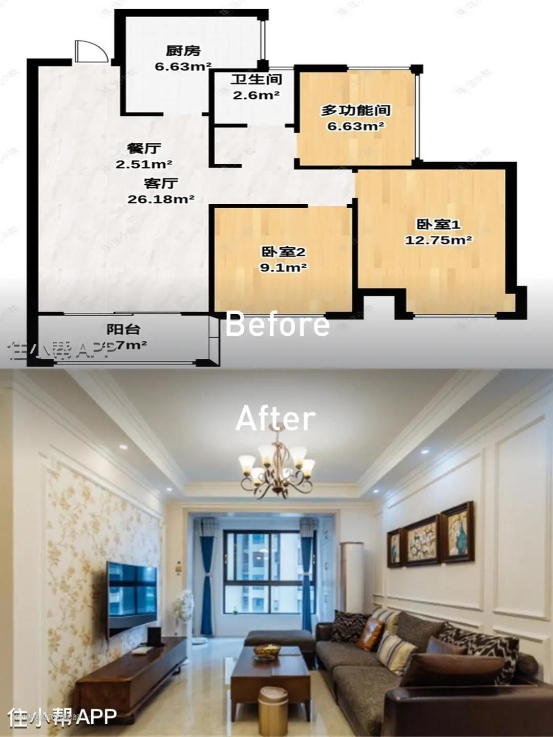 该作品是套三居室的户型,常见的竖厅户型,整体的布局都是合理的,就是面积不是特别大,加上业主夫妇喜欢欧式风,就担心空间局促,希望让公区显大一点。