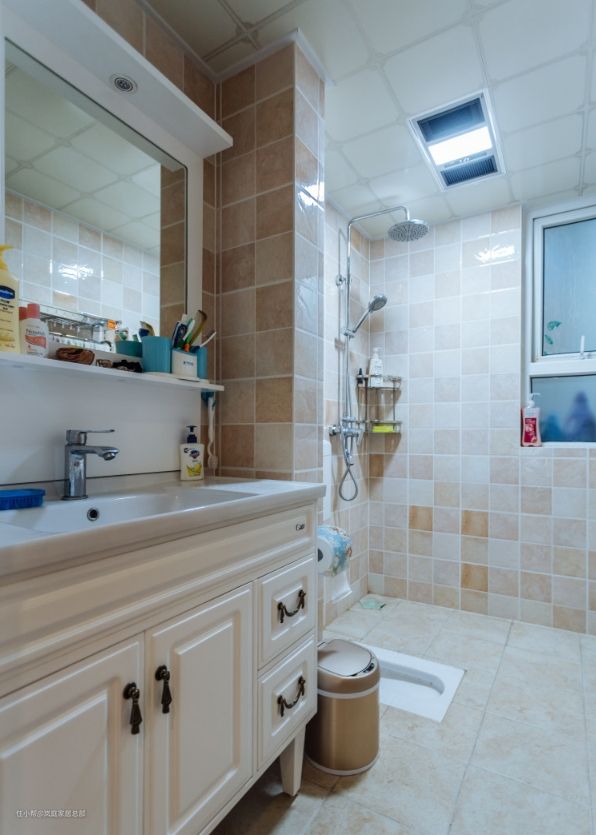 主卫舍弃了干湿分离,这样空间看上去不会觉得局促。整个墙地面都是选择耐脏的米黄色拼接瓷砖铺贴,既耐脏,也不会过时。 搭配上白色的洗漱台,落地式的款式,也是欧式风里常见的搭配,底部也是留空的设计,打扫无卫生死角。