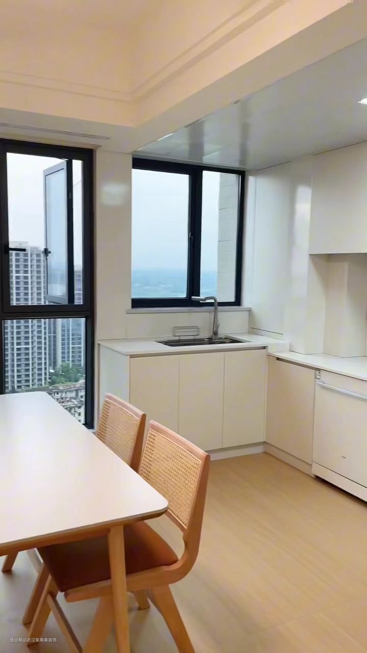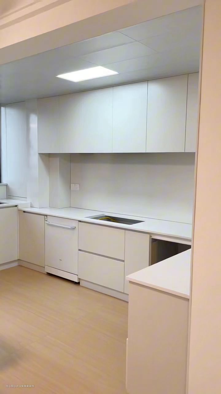 厨房空间是一个u型结构,白色的橱柜和石英石台面,美观显大。台面做了高低台设计,高台面88CM,低台面81CM,根据业主的身高定制,更加科学。