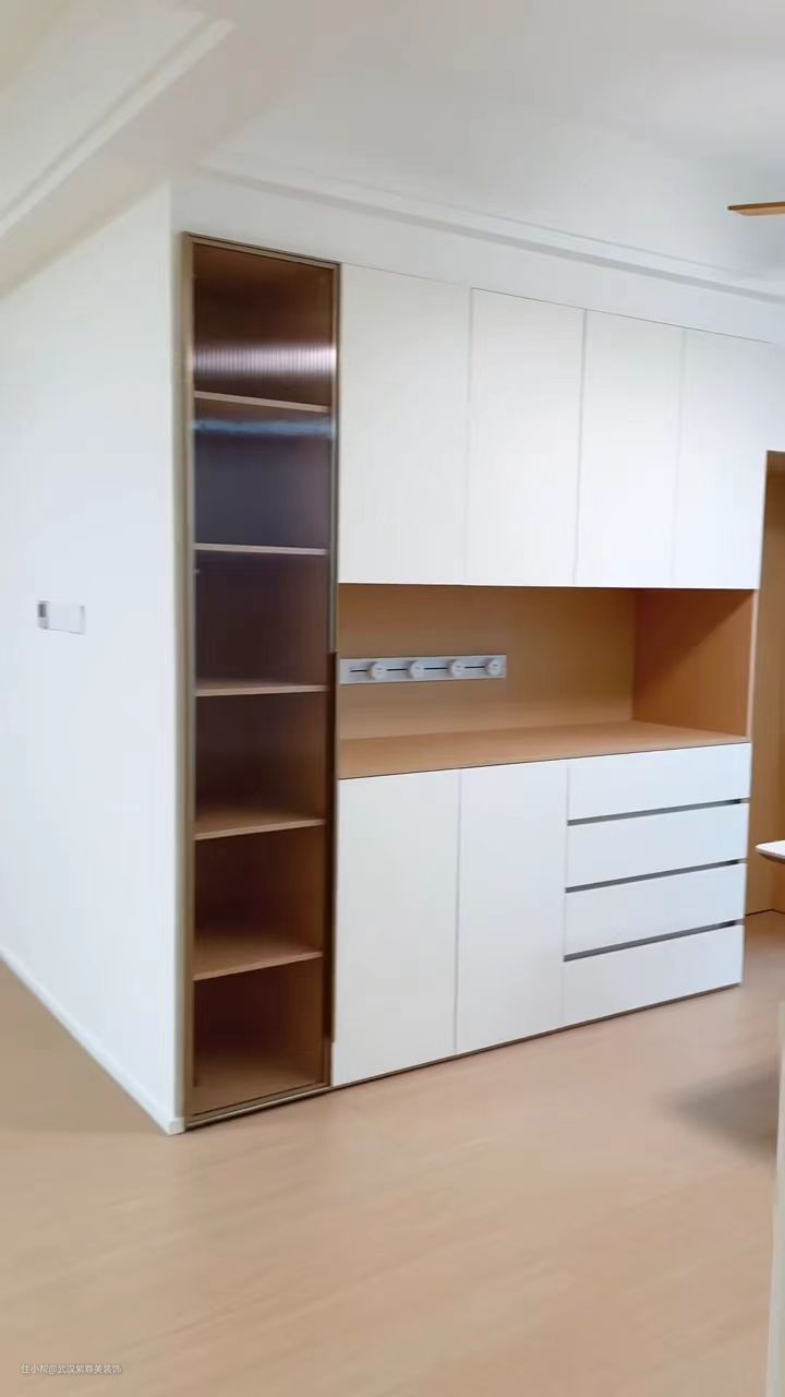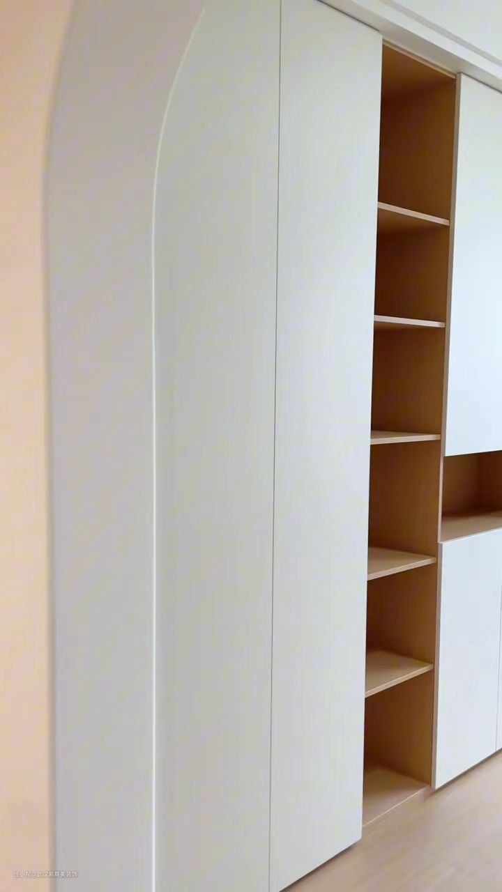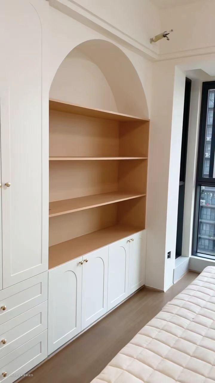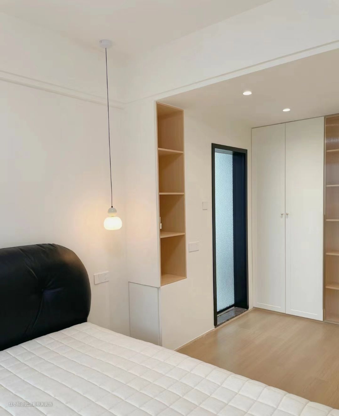卧室是宜居的休憩空间,相比过于繁复的装饰、丰富的色彩,简单的线条加上白,木色的配色,更容易使视觉放松,人 的心情也易变得舒缓。 床尾是一整面的衣柜,还做了一个圆弧形状的开放格,更加有设计感和层次感。
