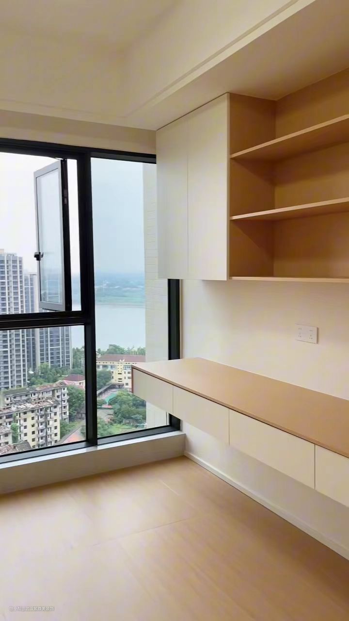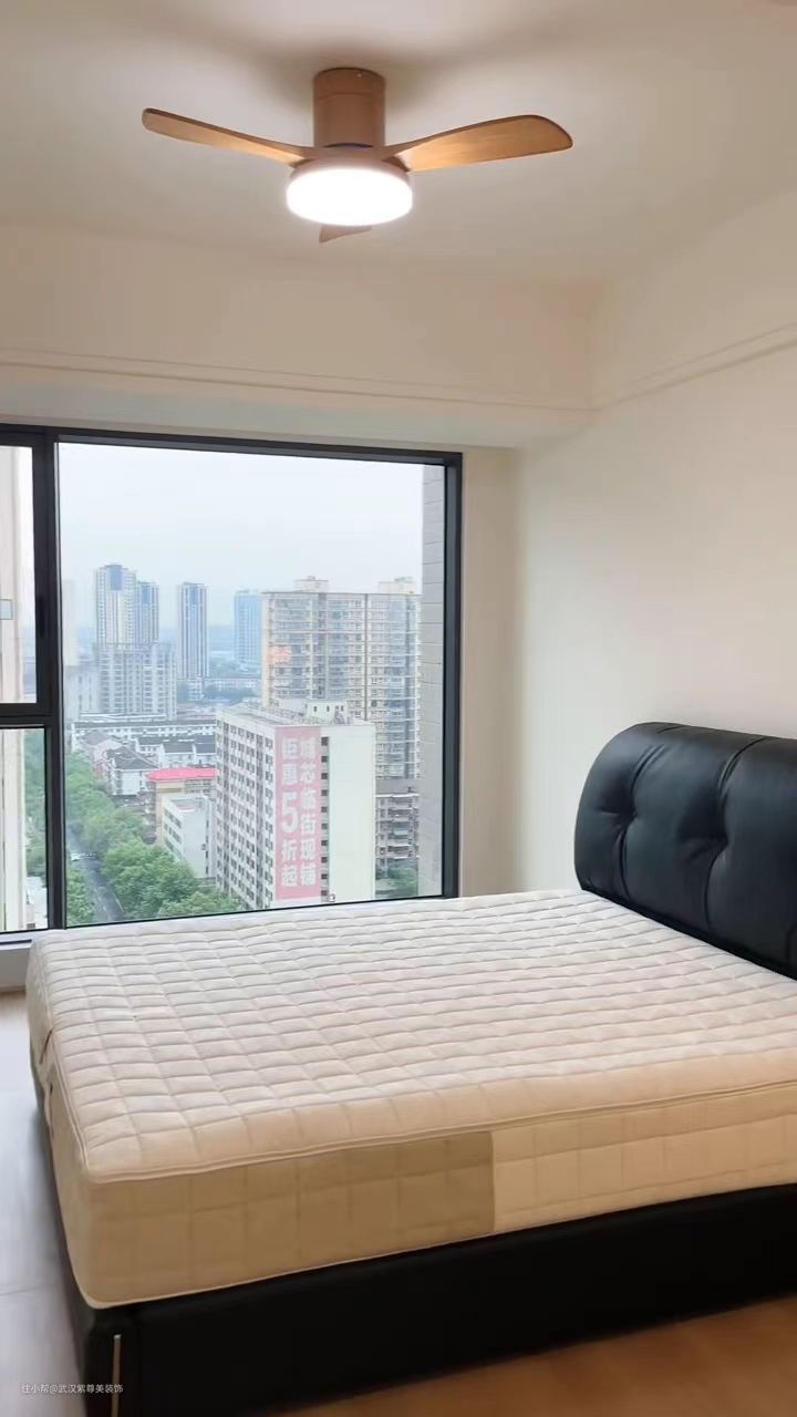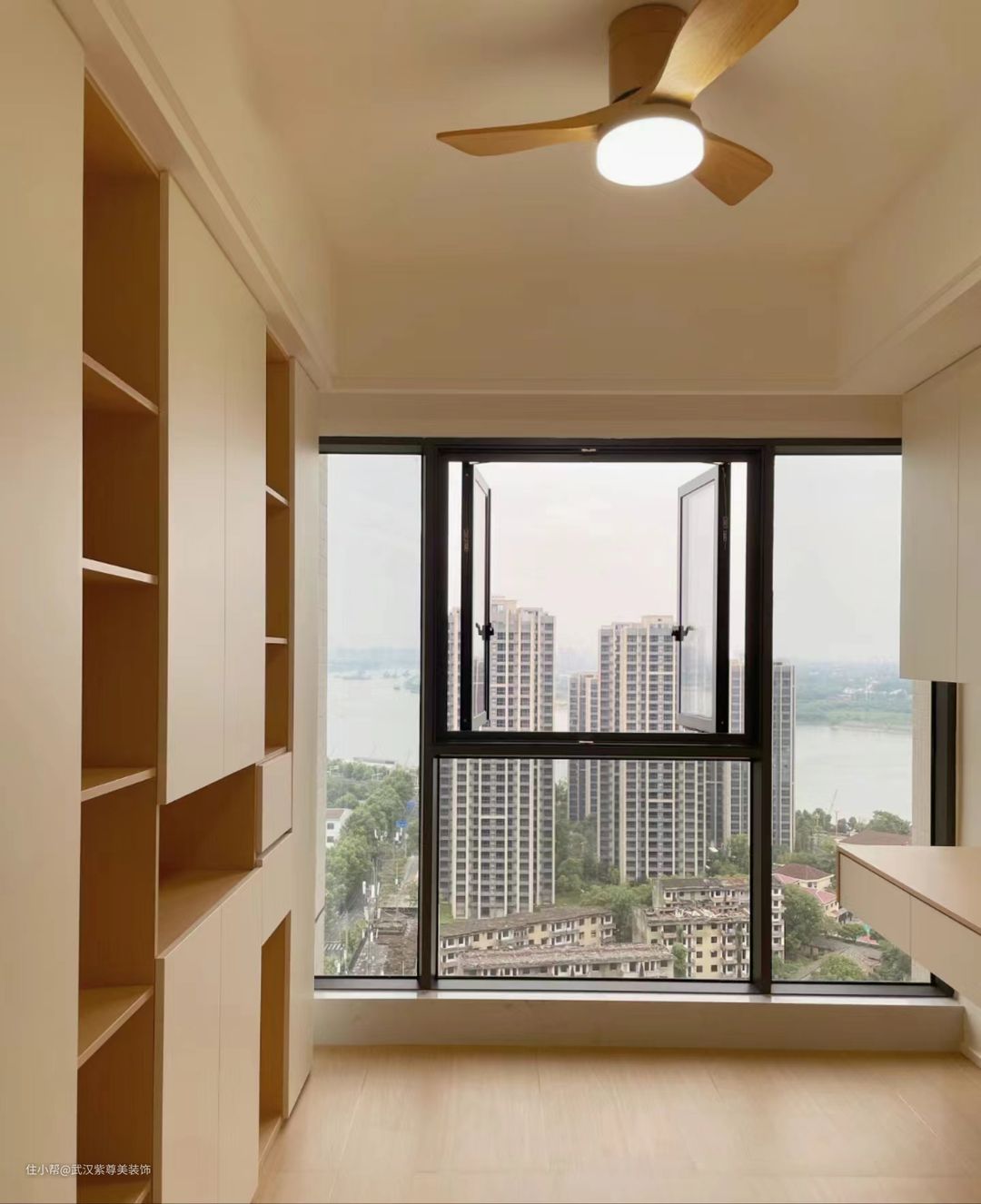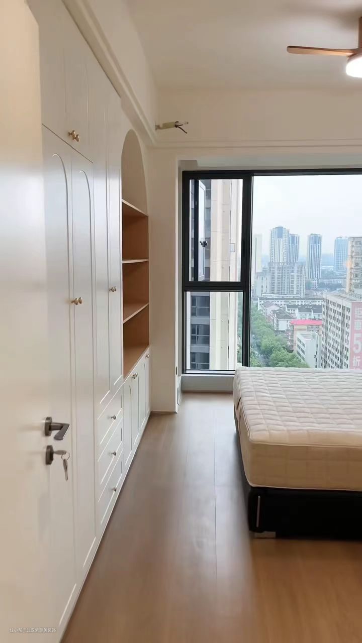 卧室是宜居的休憩空间,相比过于繁复的装饰、丰富的色彩,简单的线条加上白,木色的配色,更容易使视觉放松,人 的心情也易变得舒缓。 床尾是一整面的衣柜,还做了一个圆弧形状的开放格,更加有设计感和层次感。