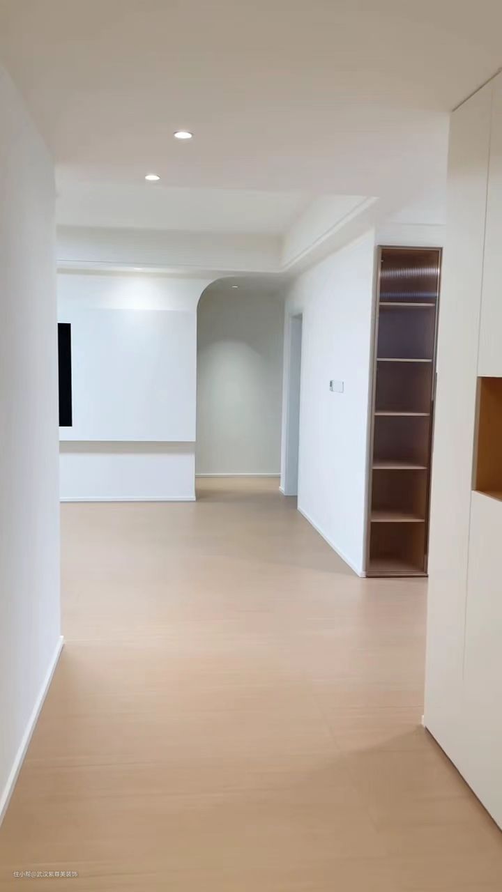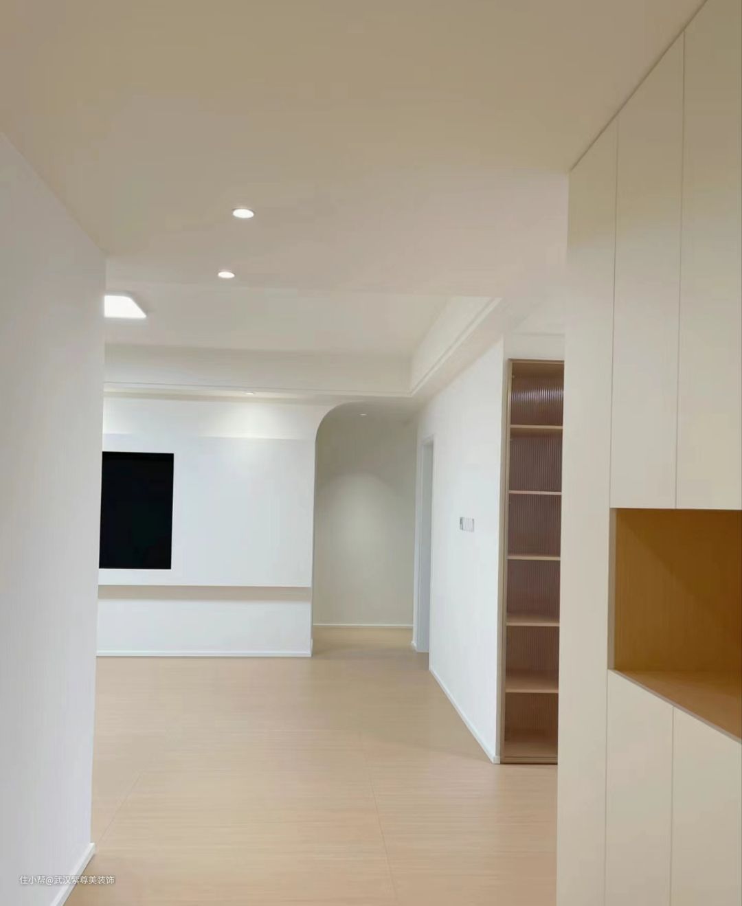 玄关是入户后第一眼的视觉焦点,白色乳胶漆+木色地板,功能与形式结合。门厅与客餐厅从视觉上有了延续,入 户的仪式感倍增 客厅做的是极简弧形背景墙,做了一个简单的双眼皮吊顶,简单耐看不藏灰。