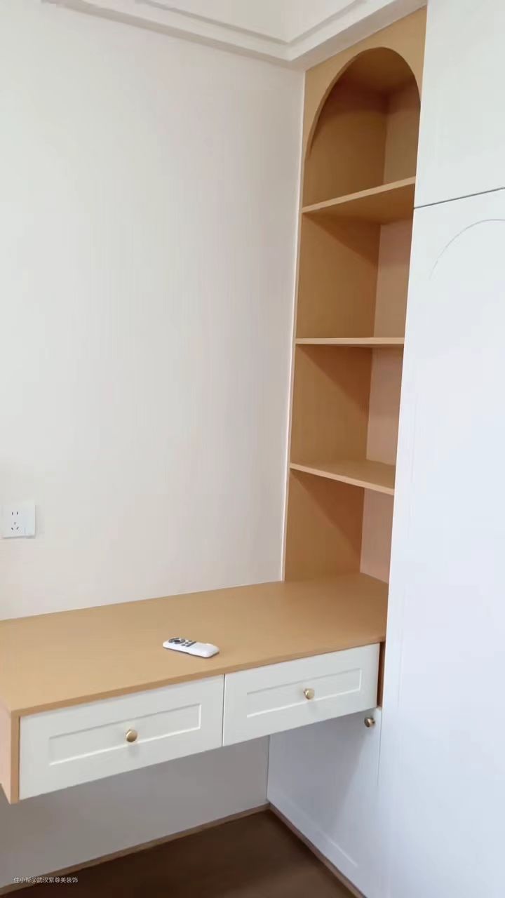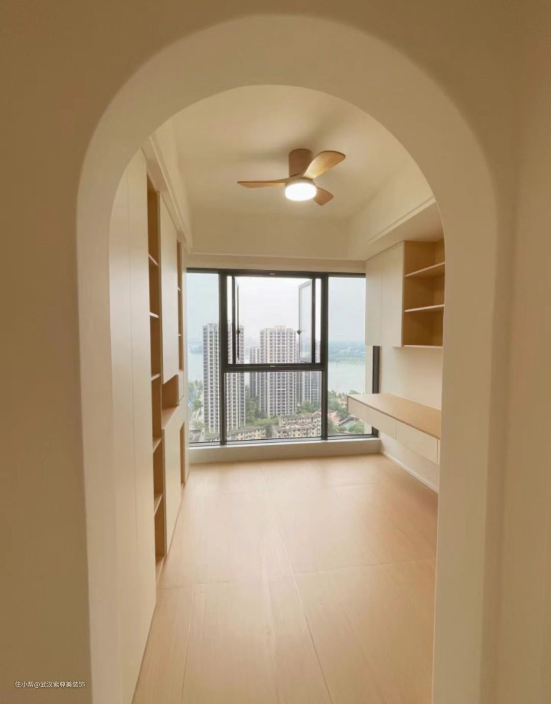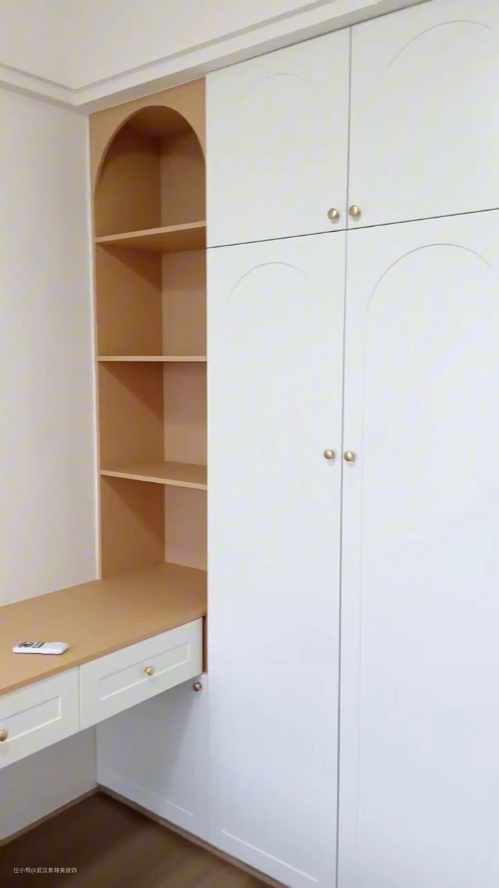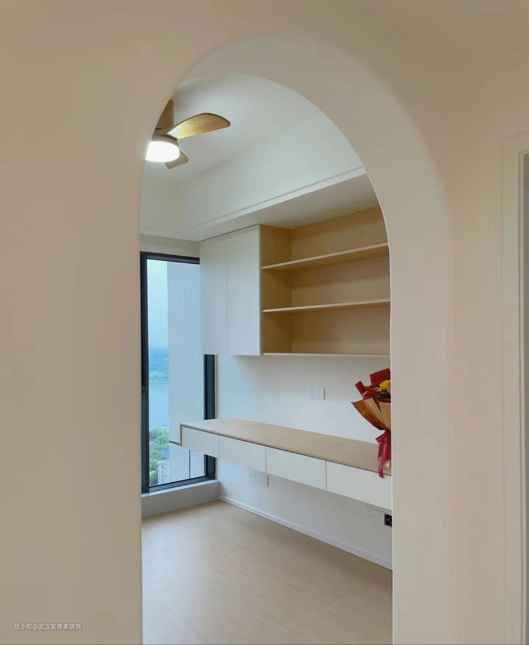 书房在入户旁边,利用入户花园做的书房,拱形门开放式设计,让空间更加通透。一边是收纳柜,一边是书桌。