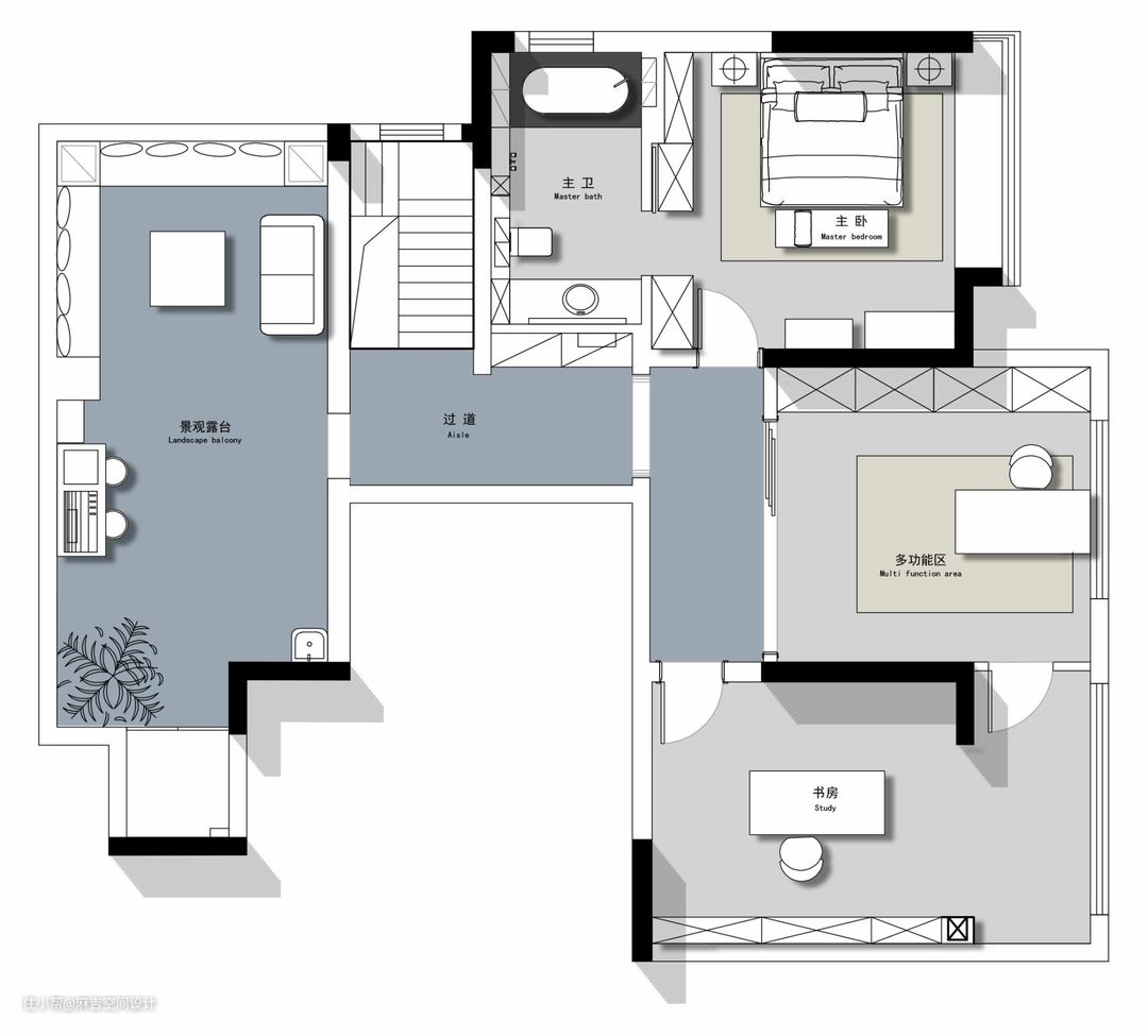 著名建筑师贝聿铭说过:“对于我来说,光是建筑中最重要的元素。”男主书房,在阳台上方设计了造型天窗,不仅提升了空间的品质感,也体现了对光线运用的独特见解。