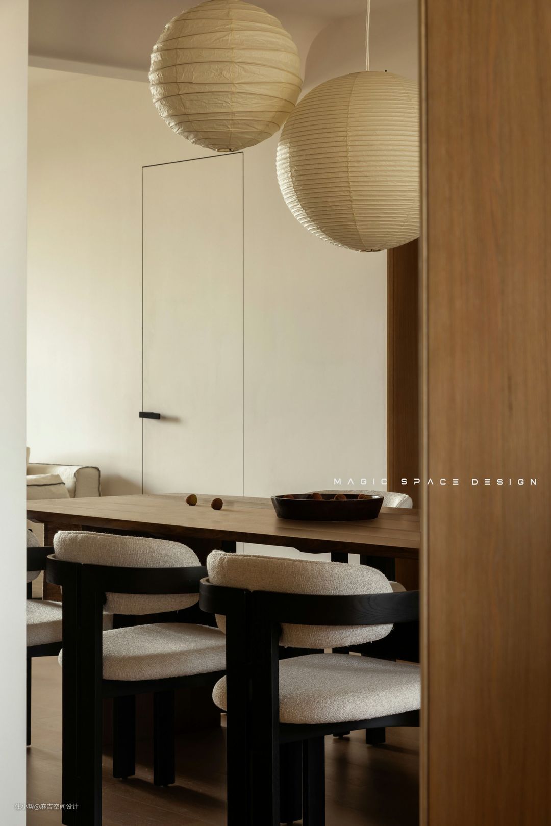 烟熏橡木餐桌,负责沉淀时光,记录故事。野口勇的Ozeki.AKari组合吊灯表现出有机的球面艺术,洒下一片温柔与静悦,让自然、艺术与文化轻松交织。