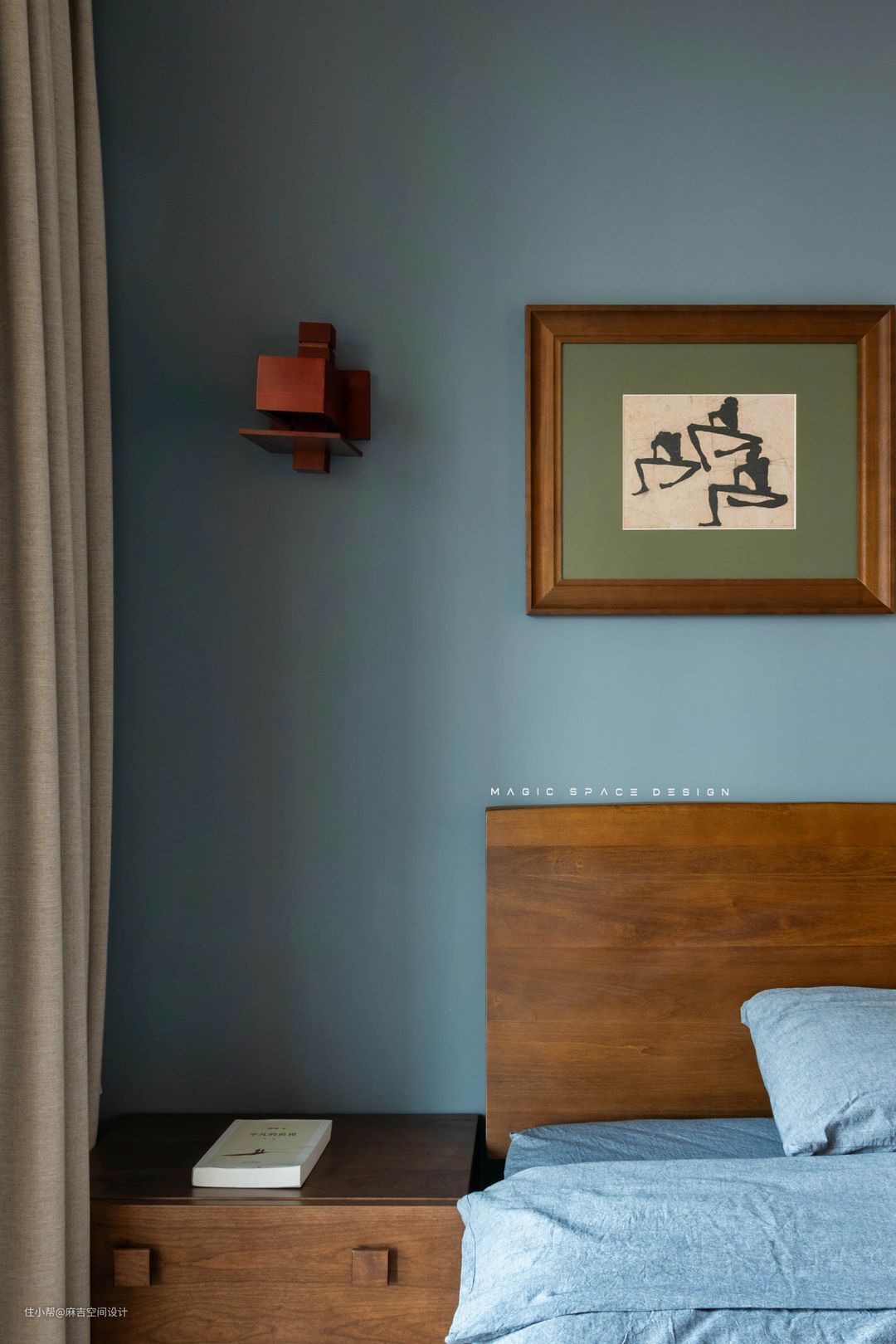 不仅仅是在创造一个居住空间,更是在打造一种生活方式。客房,渲染蓝调,再由胡桃木色中和空间温度,带人找到另一种栖居诗意。挂画中的木色与绿色相得益彰,中古组合让人耳目一新。
