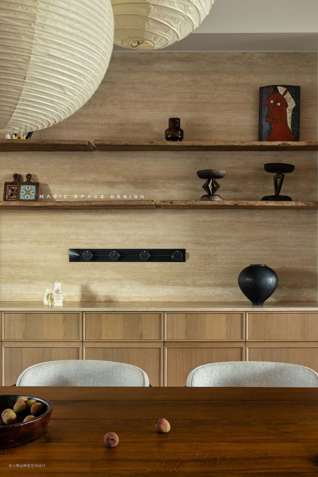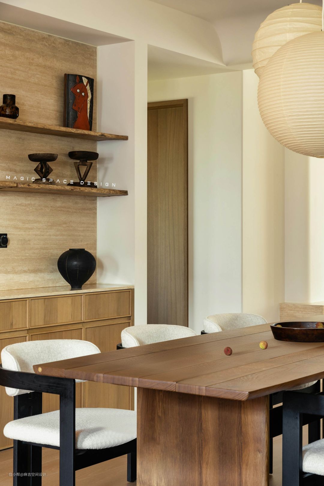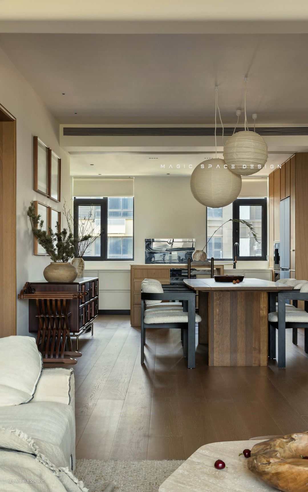 烟熏橡木餐桌,负责沉淀时光,记录故事。野口勇的Ozeki.AKari组合吊灯表现出有机的球面艺术,洒下一片温柔与静悦,让自然、艺术与文化轻松交织。